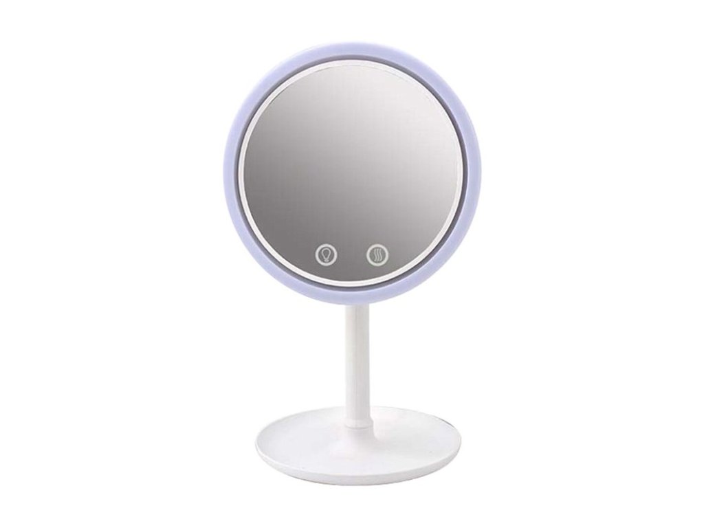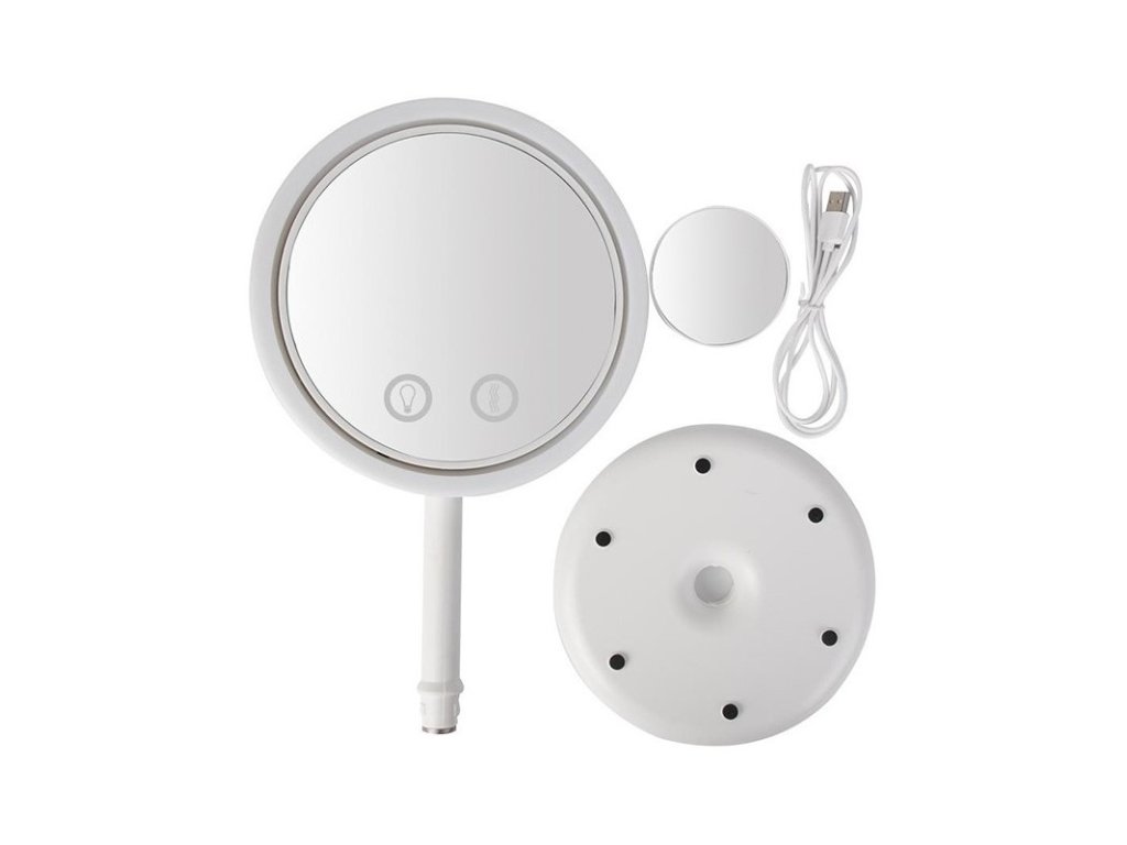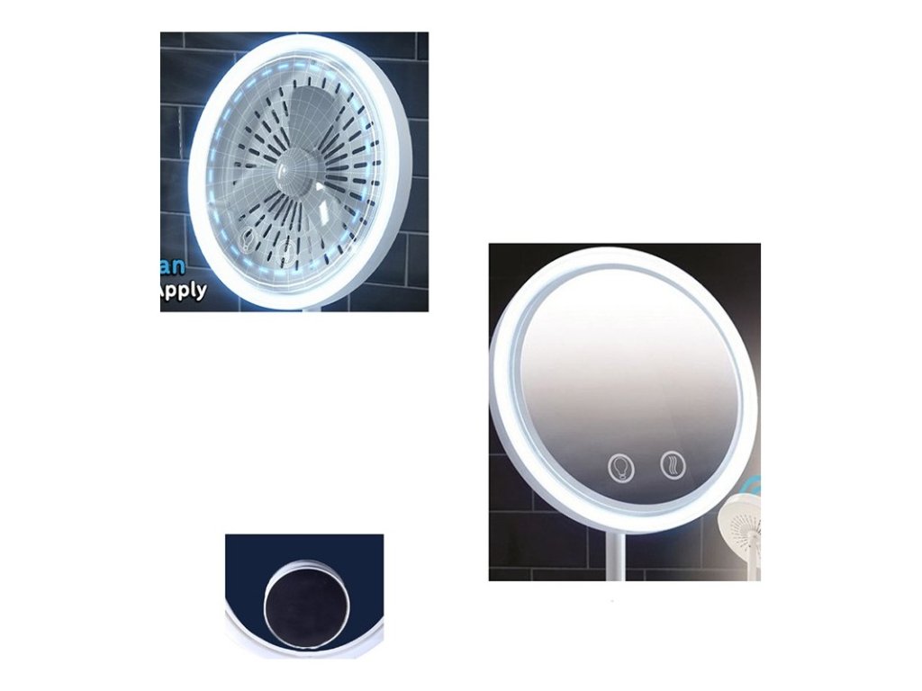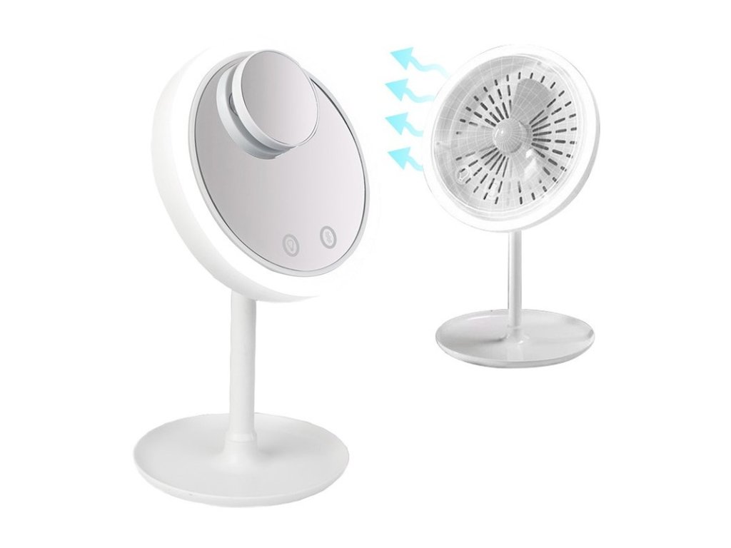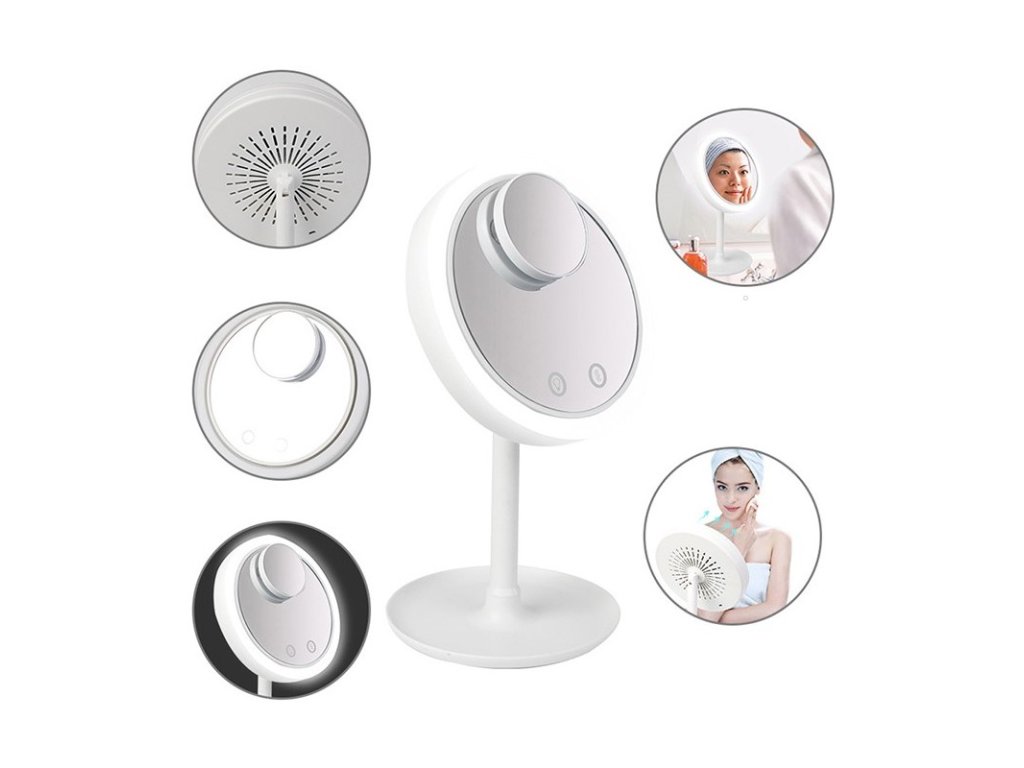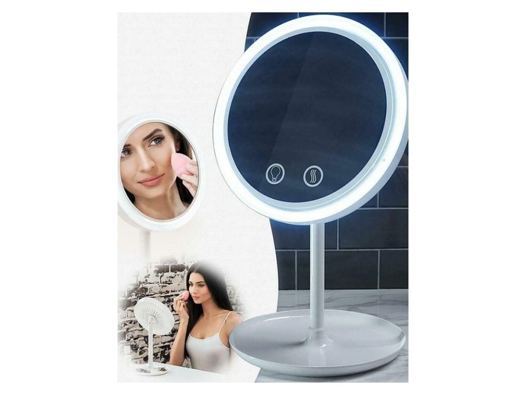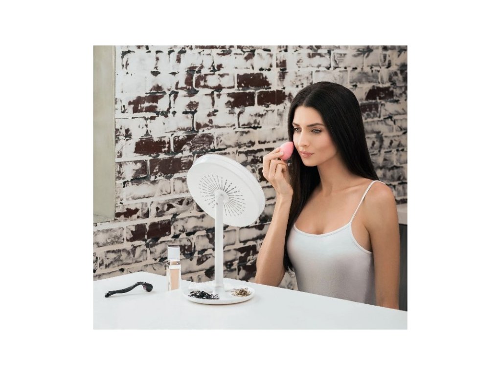 A megvilágított tükör nagyon praktikus és rendkívül hasznos eszköz a szépítéshez, sminkeléshez vagy kontaktlencse felhelyezéshez. A sminkelés során biztosítja az arc, a nyak és a dekoltázs minden részének megfelelő láthatóságát. A tükör köré LED-es világítás kerül elhelyezésre, így a sminkelés során nem keletkeznek árnyékok az arcon, ami tökéletes szimmetriát tesz lehetővé az arc mindkét felén. A tükörbe két gomb van beépítve, az egyik a LED világításhoz, a másik a szellőzőnyílásokhoz. A tükör három fokozatú légáramlás szabályozással rendelkezik. A ventilátor hűvös marad a sminkelés során. Ezen kívül van egy kis kivehető tükör, tapadókoronggal, 5-szörös nagyítással. Ideális sminkeléshez és egyéb odafigyelést és rendkívüli precizitást igénylő kozmetikai eljárásokhoz, mint például a kontaktlencse felhelyezése vagy a szemöldökcsipesz használata. A tükör beépített akkumulátorral rendelkezik, és USB-kábellel tölthető. A tükör dőlésszöge 360°-ban állítható, így a felhasználó egyéni igényeihez igazítható.