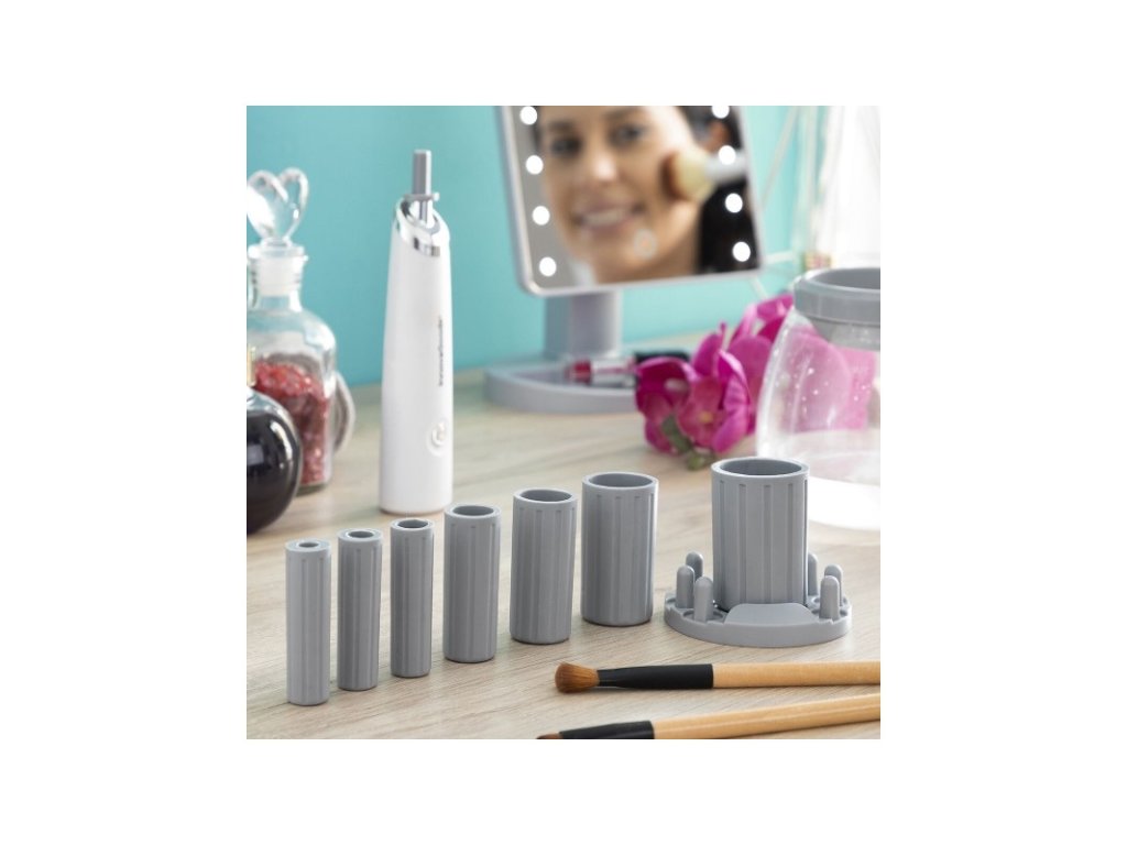 Eredeti automata sminkecset tisztító és szárító, amely segít a higiénia javításában és az egészségesebb bőr megőrzésében. Modern multifunkcionális elektromos készülék 2 az 1-ben a kényelmes, gyors és egyszerű öntisztulásért, amely néhány másodperc (kb. 25 s) alatti hatékony mosásból és szárításból áll. A forgó elektromos készüléket szorítótartozékokkal (beleértve a pótalkatrészeket is) a fröccsenő víz ellen fedéllel ellátott tálka egészíti ki; a mozgás gyakorisága a tisztítás során eléri a 7000 ford./perc értéket. A készülék a legtöbb sminkecsethez alkalmas; 8 db különböző átmérőjű tartót tartalmaz (30-24-19-15-11-9-7-5 mm), ami leginkább a fogantyú átmérőjének felel meg. A pad-szervező lehetővé teszi a tartók megbízható tárolását és helyet takarít meg. A hordozható eszköz elemmel működik (2 x AAA, nem tartozék), kábelek vagy csatlakozók nélkül; ezért bárhol könnyen magával vihető és használható. Egyetlen gombbal lehet be- és kikapcsolni. A csomag használati utasítást tartalmaz. Az eszköz eltávolításának lehetősége megkönnyíti a tárolást.