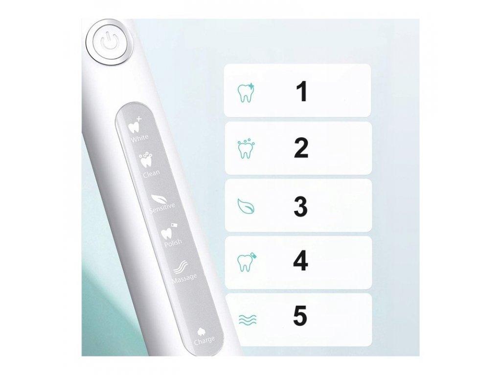 Állítsa be az ecset mozdulatát igényeinek megfelelően. A készülék 5 üzemmóddal van felszerelve, amelyek közül választhat. A Clean ideális mindennapi használatra, a White pedig lehetővé teszi, hogy még a legmakacsabb fogkőtől és foltoktól is megszabaduljon. A masszázs ínymasszázst, a Polish pedig az elülső fogak polírozását teszi lehetővé. Van egy gyengéd érzékeny mód is.