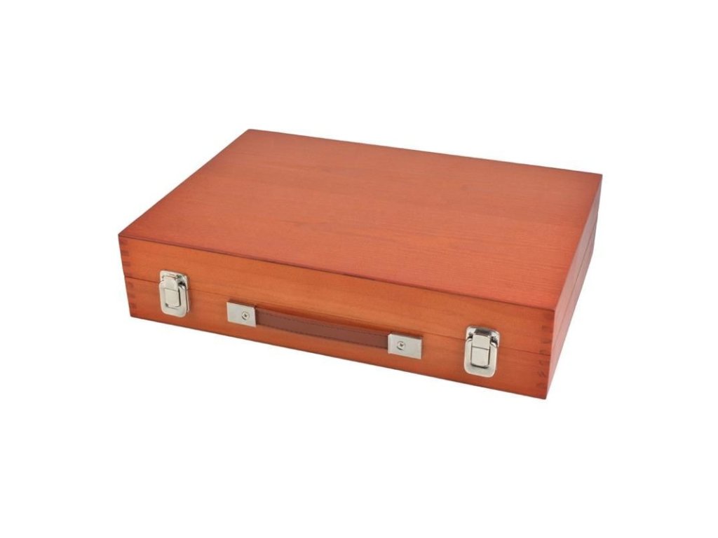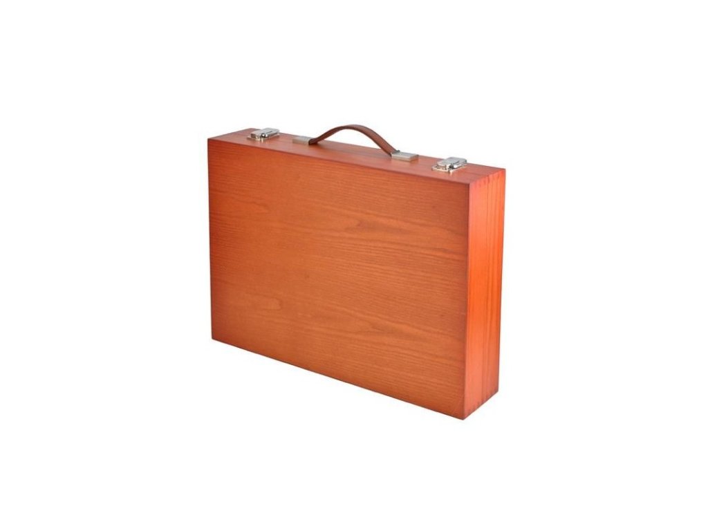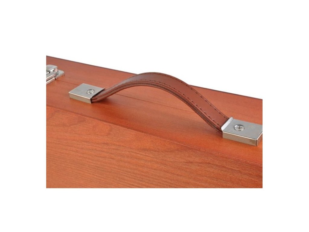 Az egész készlet egy elegáns összecsukható tokban van elhelyezve, ami fából készült, ami kétségtelenül növeli esztétikai értékét, valamint kihat a tartósságára is. A bőrönd strapabíró, bőr és kényelmes fogantyúval rendelkezik, így a teljes tartalom szállítása egyszerű és kényelmes, egyben növeli a használat elégedettségét. A fém, erős csatok garantálják, hogy a bőrönd szorosan zárva lesz szállítás közben, és semmi sem vész el.