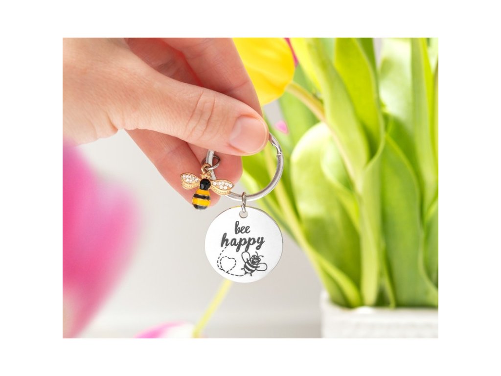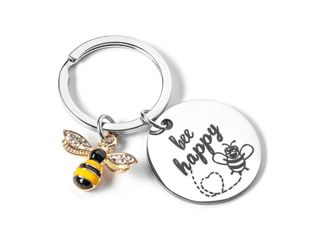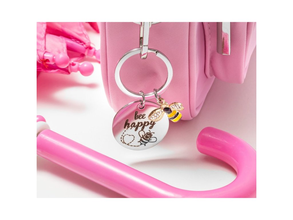- fém kulcstartó gyűrűvel kulcsokhoz és egyéb apró tárgyakhoz, egy korong "bee happy" felirattal és egy méh