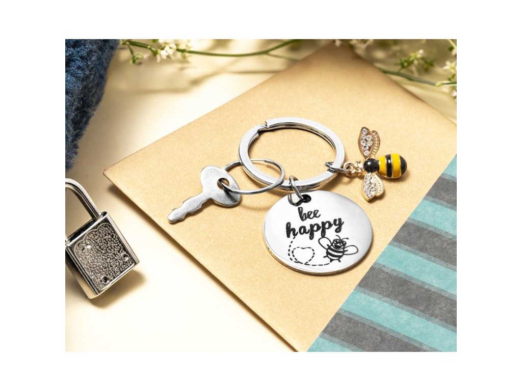 A kulcstartó a gravírozott korongon kívül a kulcsok vagy egyéb apróságok rögzítésére szolgáló fém karikából és egy gyönyörű fekete-sárga, szokás szerint apró cirkóniákkal tűzdelt szárnyú méhecskéből áll. A kulcstartó kiváló minőségű rozsdamentes acélból készült, ami tartóssá és ellenállóvá teszi a külső tényezőkkel és az idő múlásával szemben. Egyedülálló kulcstartó egyedi emberek számára.