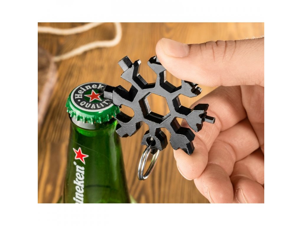 Remek zsebméretű multifunkciós szerszám! Vidd magaddal mindenhová, ahova mész. Nagyon hasznos otthon vagy a szabadban. A fém karikának köszönhetően normál kulcstartóként is használható. Hópehely szerszámunk 18 féle funkcionális eszközt tartalmaz: sörnyitó, zsinegkés, lapos csavarhúzó és dobozvágó, kereszt csavarhúzó, különböző méretű imbuszkulcsok (3mm, 4mm, 5mm, 6mm, 7mm, 8mm), különböző méretű lapos villáskulcs 7 mm, 8 mm, 9 mm, 10 mm, 11 mm, 12 mm, 14 mm