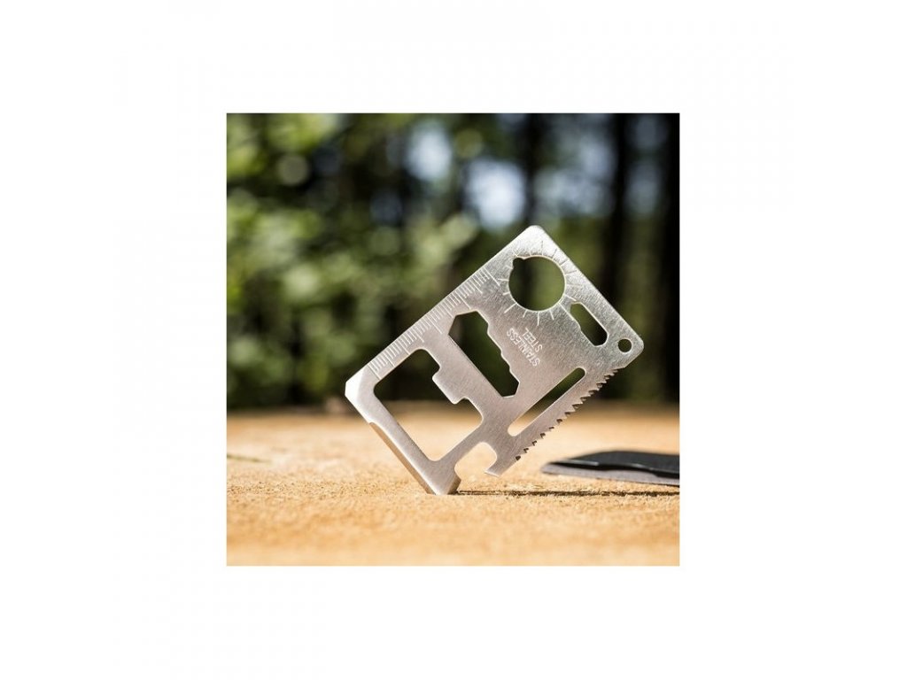A nagyon kompakt méretekkel és kis tömeggel rendelkező kártya számos eszközt kombinál. Alkalmas mindennapi zsebben hordásra. A túlélési kártya a sokkal terjedelmesebb felszerelést helyettesíti különféle kisebb feladatokhoz. A kártya rozsdamentes acélból készült, és megfelelő használat mellett szinte elpusztíthatatlan.