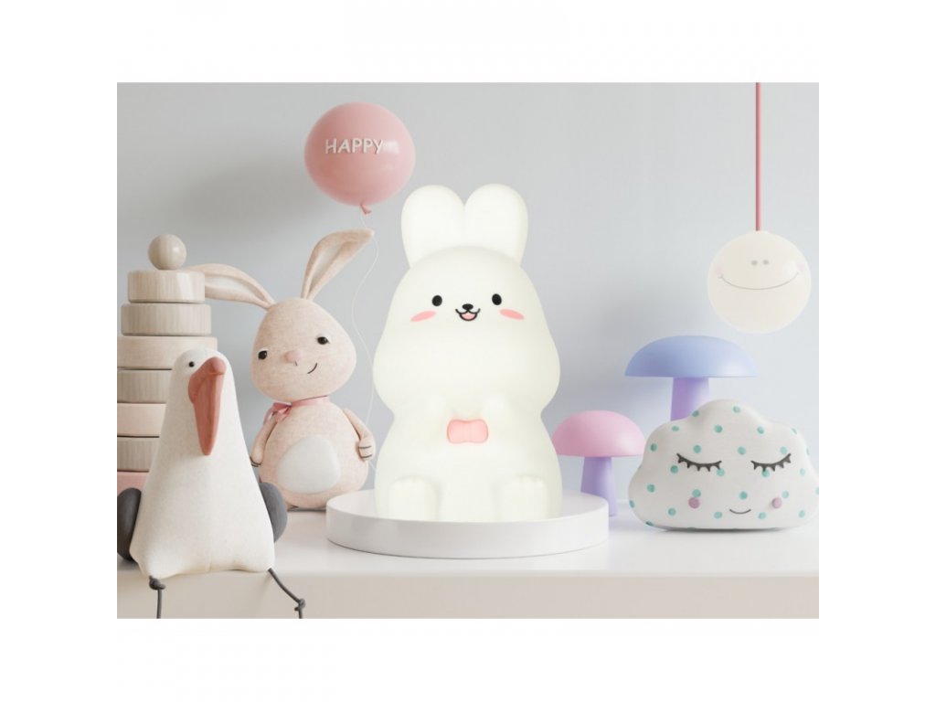 Ez a gyereklámpa nagyon praktikus és aranyos, kellemessé varázsolja az estét és jó alvást biztosít. Kétségtelenül hasznos lesz minden olyan gyermek számára, aki érdeklődik az állatok iránt, valamint azoknak, akik félnek a sötéttől. A lágy színek, a csinos szemek és az aranyos arc esztétikai értéket és bájt adnak a nyuszinak. Tartós szilikonból készült, ami kihat a stabilitásra és garantálja a termék hosszú élettartamát. A lámpa erős LED fényt bocsát ki, amely hatékonyan világítja meg a sötétséget és eloszlatja a gyerekek félelmeit. A beépített akkumulátoron keresztüli tápellátás nagyon kényelmes megoldás. Ennek köszönhetően a lámpát bárhová magával viheti anélkül, hogy áramforráshoz kellene csatlakoztatnia. Praktikus lámpával a gyerek megvilágíthatja az utat, pl. a wc-re is. A termék lekerekített formájú, sima élekkel rendelkezik, és biztonságos a használata. A lámpa könnyű és kicsi, így könnyen tárolható és szállítható. Nem melegszik fel, így nem égeti meg a gyerekek kezét.