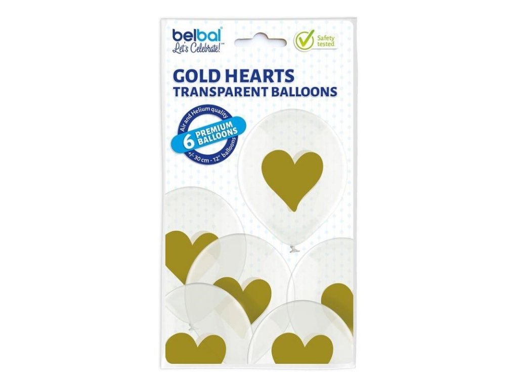 Átlátszó lufi készlet - Gold Hearts, 30cm (6 db)