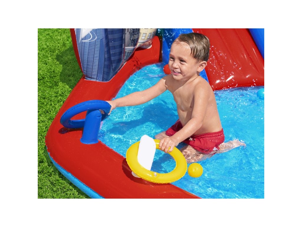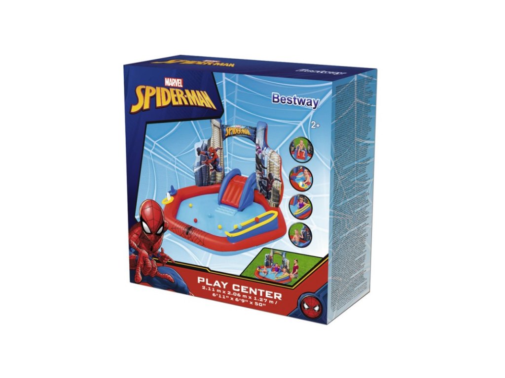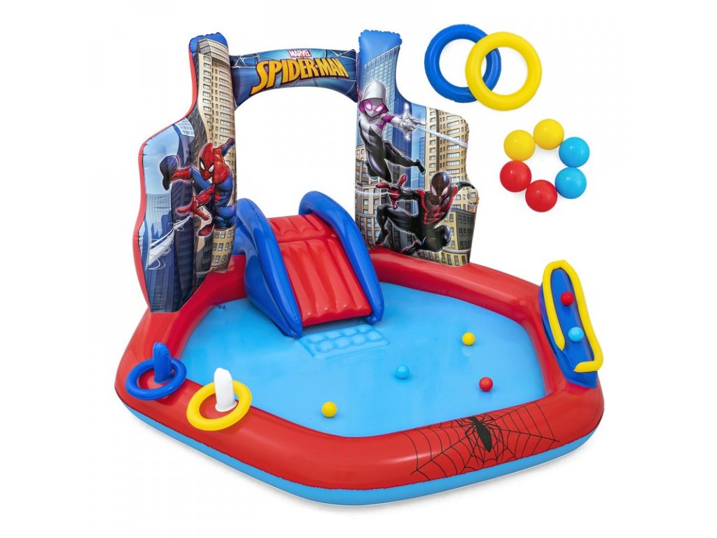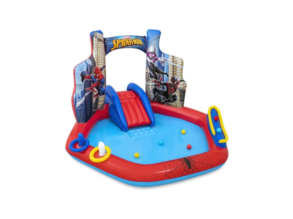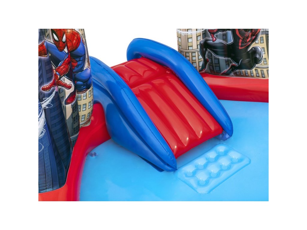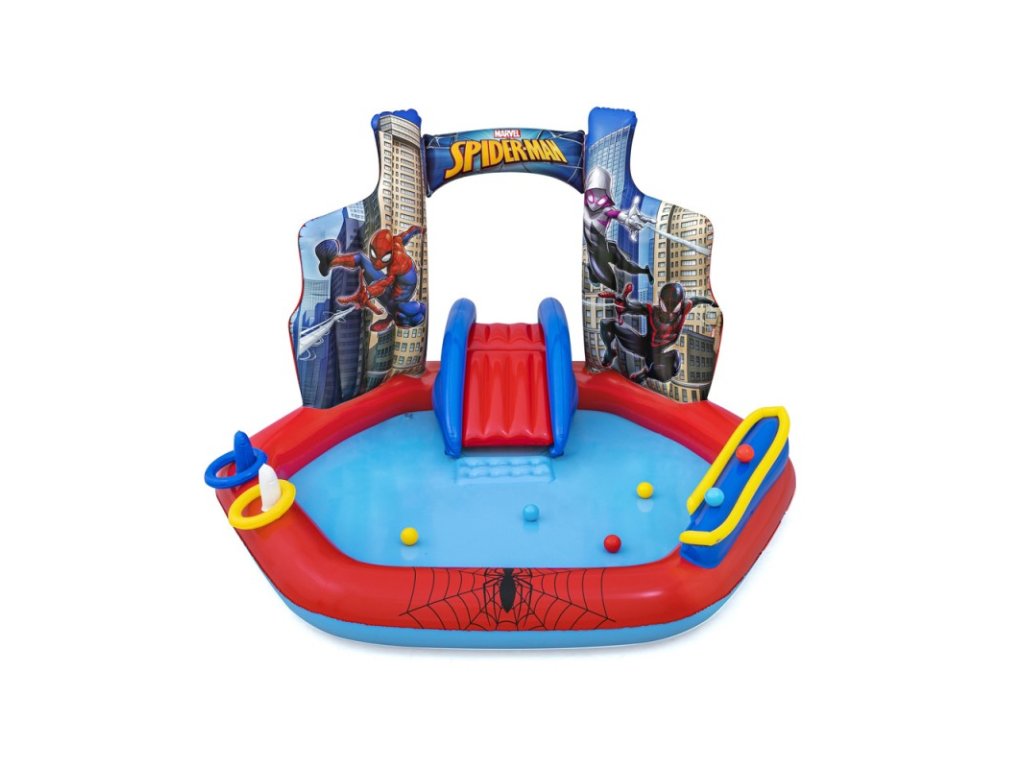 A nyári hónapok beköszöntével a gyerekek szeretnek kint lenni a napon, pancsolni és játszani a tengerben vagy a medencében. A csúszdával ellátott felfújható mini medencének és szórakoztató kütyüknek köszönhetően a vízi szórakozás központját alakíthatja ki közvetlenül a kertjében, miközben gyermekei számára biztonságos hely lesz felfrissülni a kíméletlen nyári melegben. A Marvel Spiderman vízi játszótér a Bestway kínálata a legkisebbek nyári szórakozására. Az érdekes színes grafika a híres Pókember témájával biztosan tetszeni fog minden kis szuperhősnek és barátainak is. Ez a felfújható medence sok-sok móka és felejthetetlen élményben lesz része. Ezen kívül számos érdekes látnivalóval rendelkezik, amelyeknek köszönhetően nem fárad el olyan hamar a benne lévő szórakozás. A játszótér puha, de strapabíró PVC-ből készült, intenzív színekben. Előnye a puha párnával végződő csúszda és a csúszda melletti szökőkút, amely a kerti tömlő csatlakoztatása után működik. A készlet további attrakciókat is tartalmaz: színes felfújható gyűrűket, színes labdákat, felfújható pályát - amelyen végigguríthatod a labdákat és a felfújható pöcköket, amelyek a felfújható karikákkal színesítik a szórakozást. Játék után a medence könnyen és gyorsan üríthető, szétszedhető és tárolható.