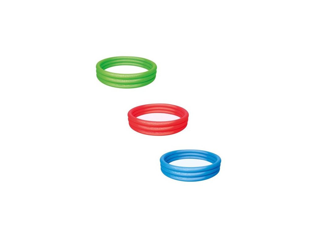 Gyönyörű háromkörös medence minden gyermek számára, akik szeretik a vízi játékot a kertben.A felfújható medence háromkamrás, 183x33cm, 3 évesnél idősebb gyermekek számáral. Három színben kapható: piros, kék és zöld.