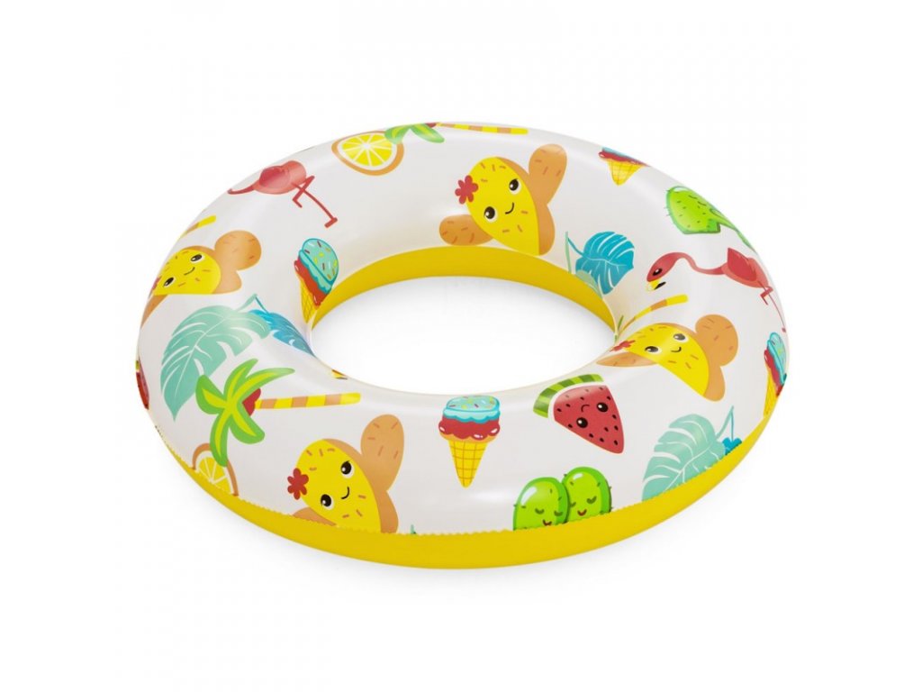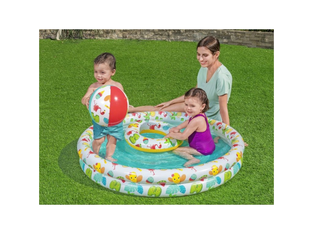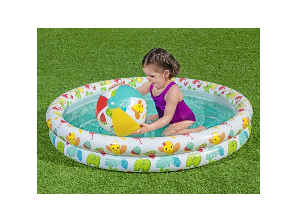 Klasszikus, strandlabdával és felfújható kerékkel ellátott medence, gyönyörű nyári grafikával remek ötlet meglepetésnek a kicsiknek. A 122 cm átmérőjű és 20 cm magas kerek felfújható medence - pancsoló 2 gyermek kényelmes elhelyezésére alkalmas. A medence 2 különálló, gyűrű alakú légkamrával rendelkezik, amelyeket egy visszacsapó szelep rögzít, amely megakadályozza a levegő kijutását. Bevizsgált, puha, strapabíró vinil anyagból készült. Kis méretének és súlyának köszönhetően bárhová magával viheti, strandra, fűbe vagy nyaralásra. A 27 cm átmérőjű, aranyos grafikával ellátott strandlabda sok-sok szórakozást nyújt a babáknak egy frissítő úszás során a teraszon. A 46 cm átmérőjű felfújható kerék 3-6 éves kor közötti gyermekek számára készült, és a gyermek székként is használhatja a medencében.
