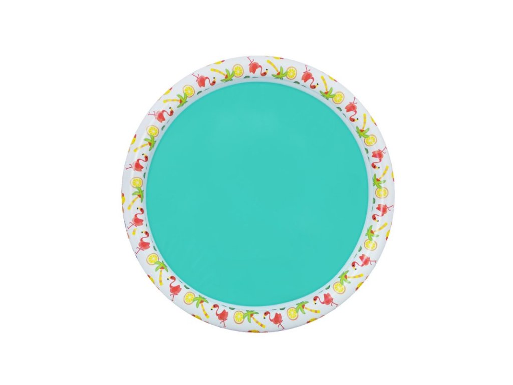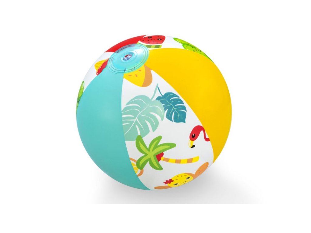 Klasszikus, strandlabdával és felfújható kerékkel ellátott medence, gyönyörű nyári grafikával remek ötlet meglepetésnek a kicsiknek.