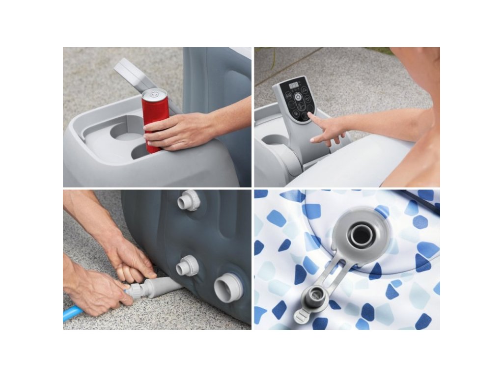 A készletben található szivattyú feladata a pezsgőfürdő gyors felfújása, a víz felmelegítése és szűrése, valamint a masszázsrendszer vezérlése. A szivattyú könnyen elérhető a pezsgőfürdő belsejéből, és italok és harapnivalók tárolására alkalmas tartókkal rendelkezik. A szivattyú tartalmaz egy 1,5°-2,0°C/h gyorsfűtési rendszert, amely 40°C-ig melegíti a vizet, valamint a Freeze Shield™ automatikus fűtési funkciót, amely megakadályozza a belső alkatrészek fagyását alacsonyabb hőmérsékleten. A legújabb integrált technológiának köszönhetően a fűtés, szűrés és szabályozás egyetlen eszközzel történik.