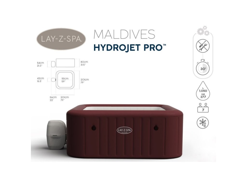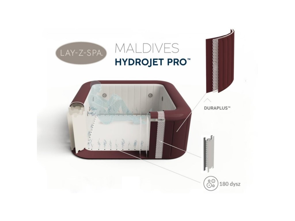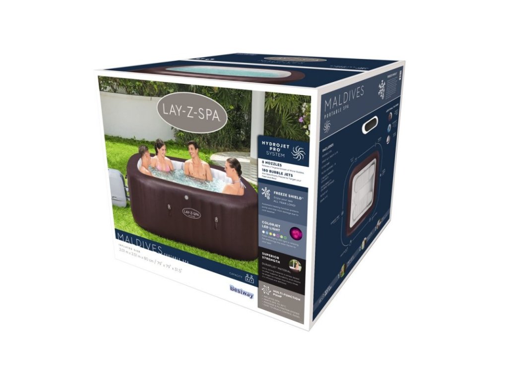 A Lay-Z-Spa Maldives jacuzzi a Bestway ajánlata. 5-7 fő részére készült, melynek köszönhetően mindenki számára kellemes kikapcsolódást biztosít. Nincs is jobb, mint egy nehéz és hosszú nap után bekapcsolni a pezsgőfürdőt, és megengedni magának, hogy kellemes lustálkodást és kikapcsolódást nyújtson. Ez a tökéletes módja a nap befejezésének. A pezsgőfürdőt ColorJet LED világítási rendszerrel szerelték fel, amely színeket vált, és még egyedibb élményeket nyújt. A Maldív-szigetek 2 felfújható napozóággyal (egy-egy mindkét oldalon) és középen egy extra ülőhellyel extra kényelmet biztosít. Mindegyikben van egy speciális rögzítés a talajhoz, hogy megakadályozzák a felfújható napozóágyak lebegését.