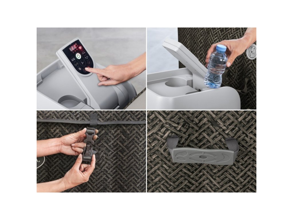- Digitális vezérlőpanel és beépített szűrőrendszerrel ellátott pezsgőfürdő-szivattyú pohártartóval rendelkezik, és a pezsgőfürdő belsejéből érhető el