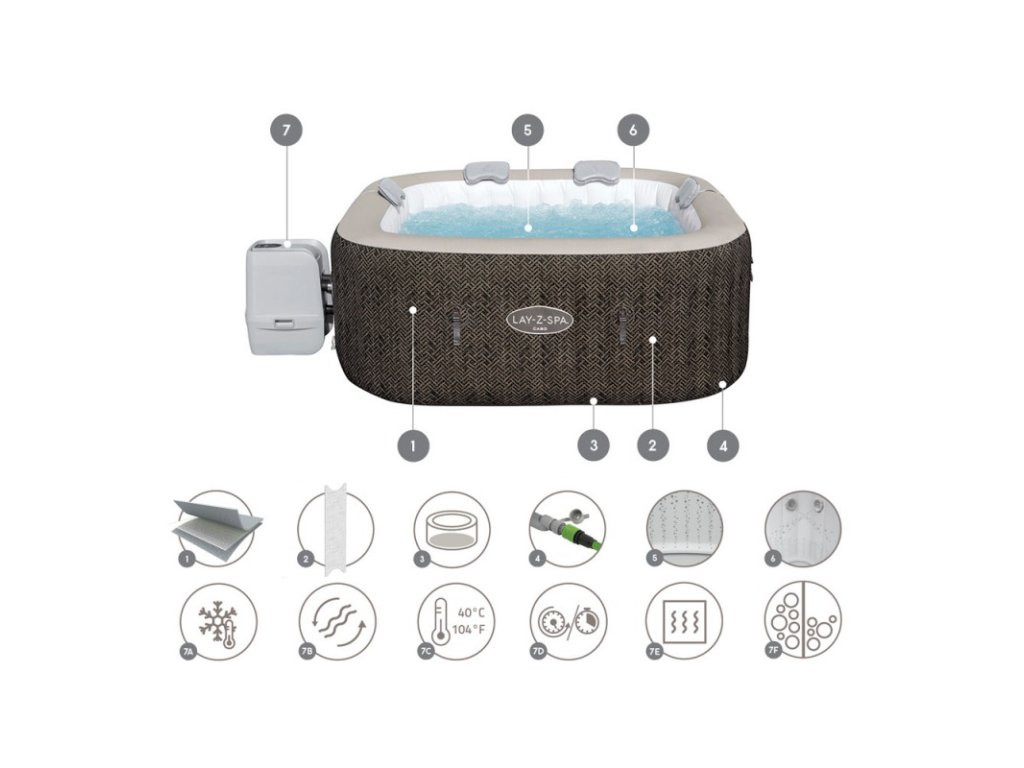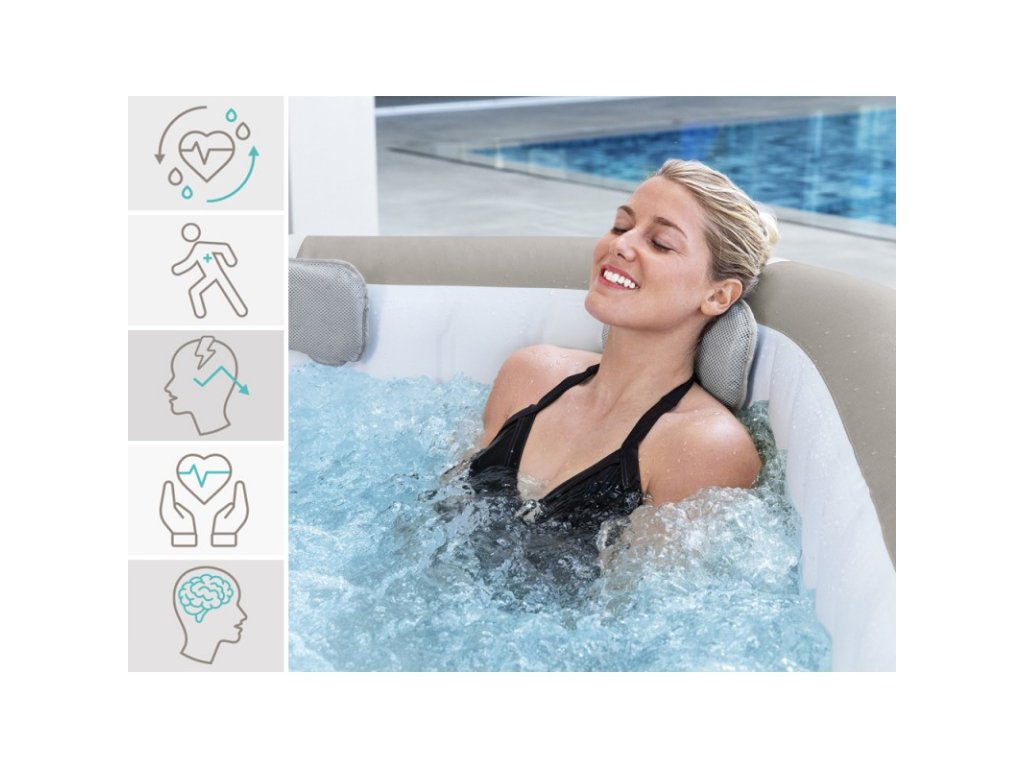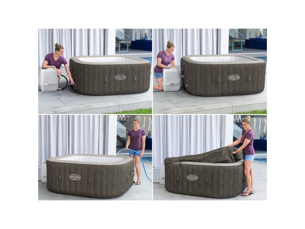 A Lay-Z-Spa teljes mértékben kihasználja négyzet alakú formáját, amely biztosítja a könnyű használatot. A pezsgőfürdőben 4-6 fő kényelmesen elfér, így ideális egy romantikus estére, családi kikapcsolódásra vagy baráti találkozókra.