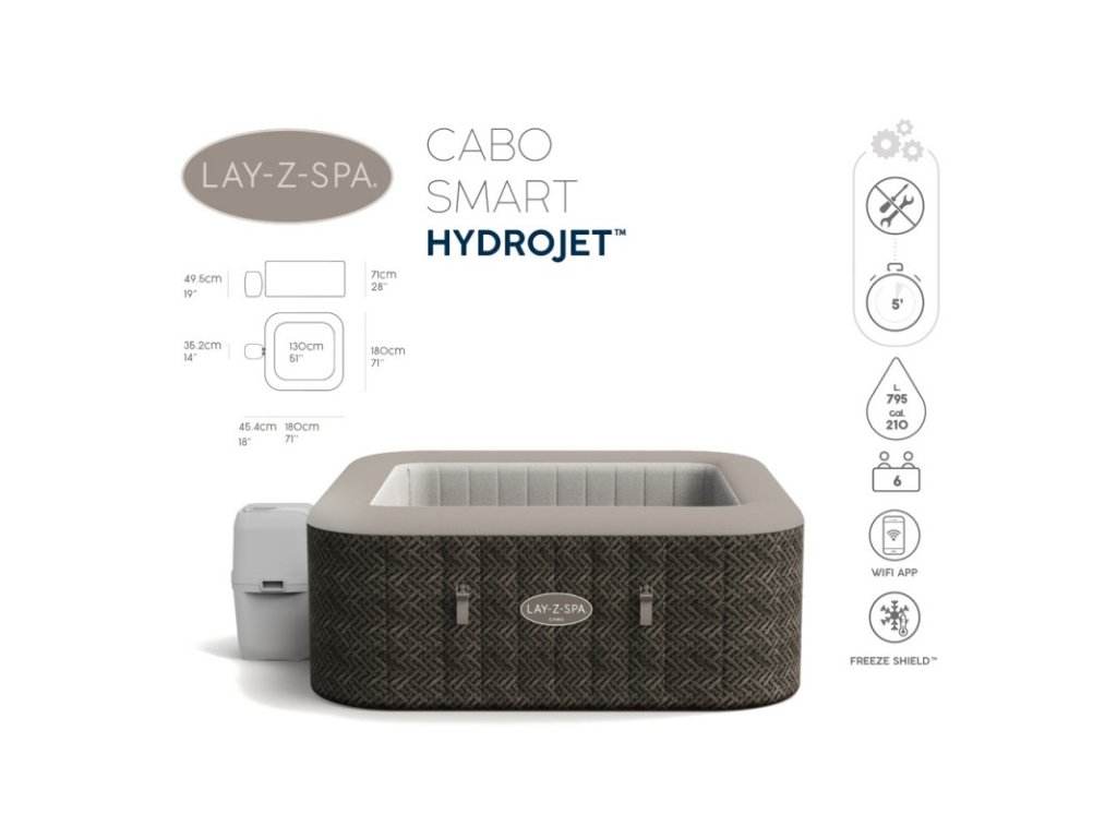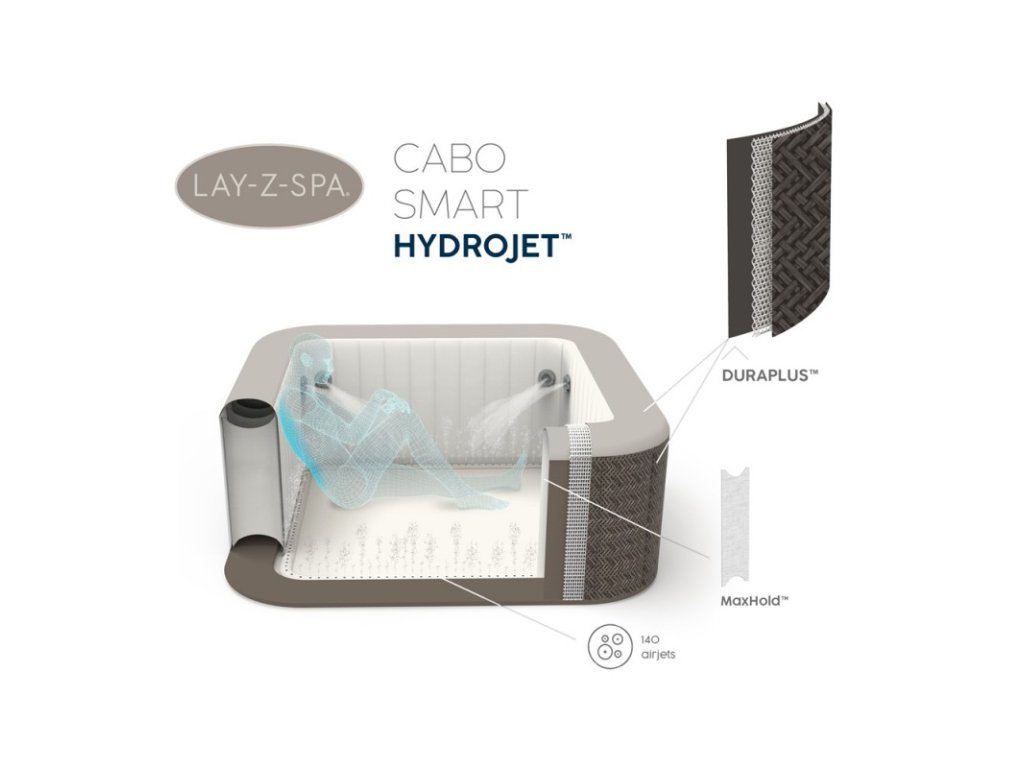 A Cabo modell beépített Wi-Fi-vel rendelkezik, így a felhasználók a Bestway Smart Hub™ alkalmazással vezérelhetik a pezsgőfürdőt. A még egyszerűbb használat érdekében az alkalmazás lehetővé teszi a víz hőmérsékletének módosítását, az energiatakarékos időzítő bekapcsolását, a víz szűrését és akár a Hydrojet masszázsrendszer elindítását is!
