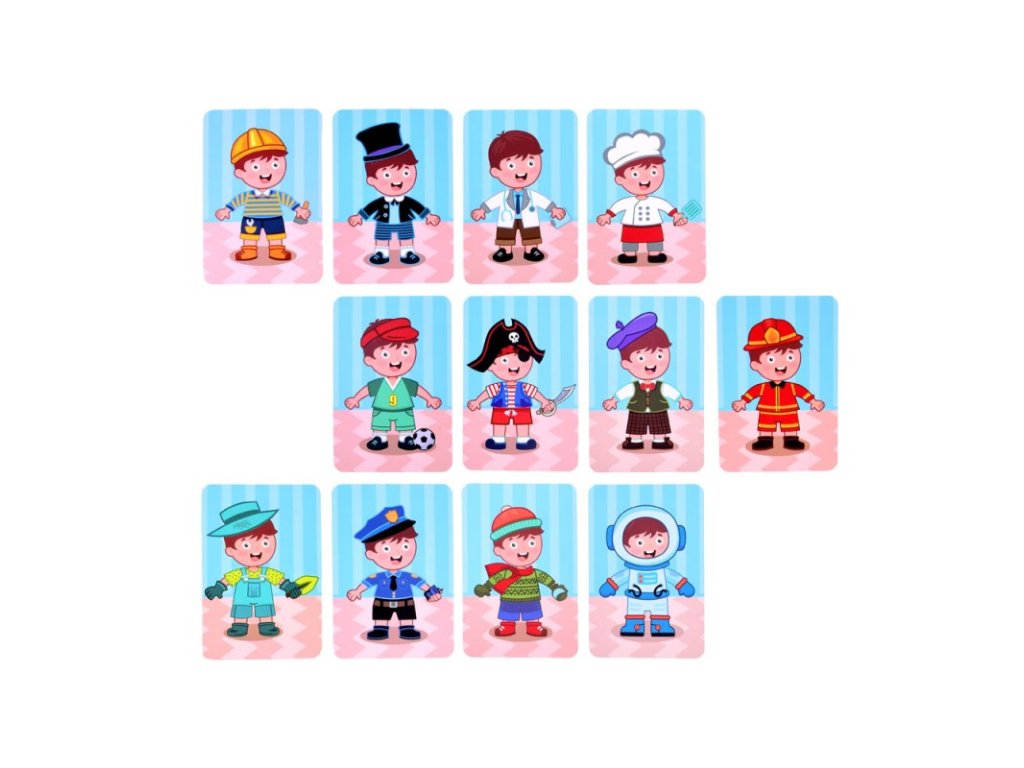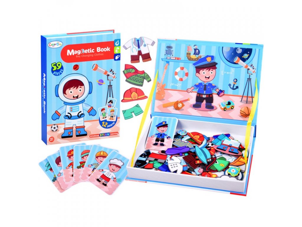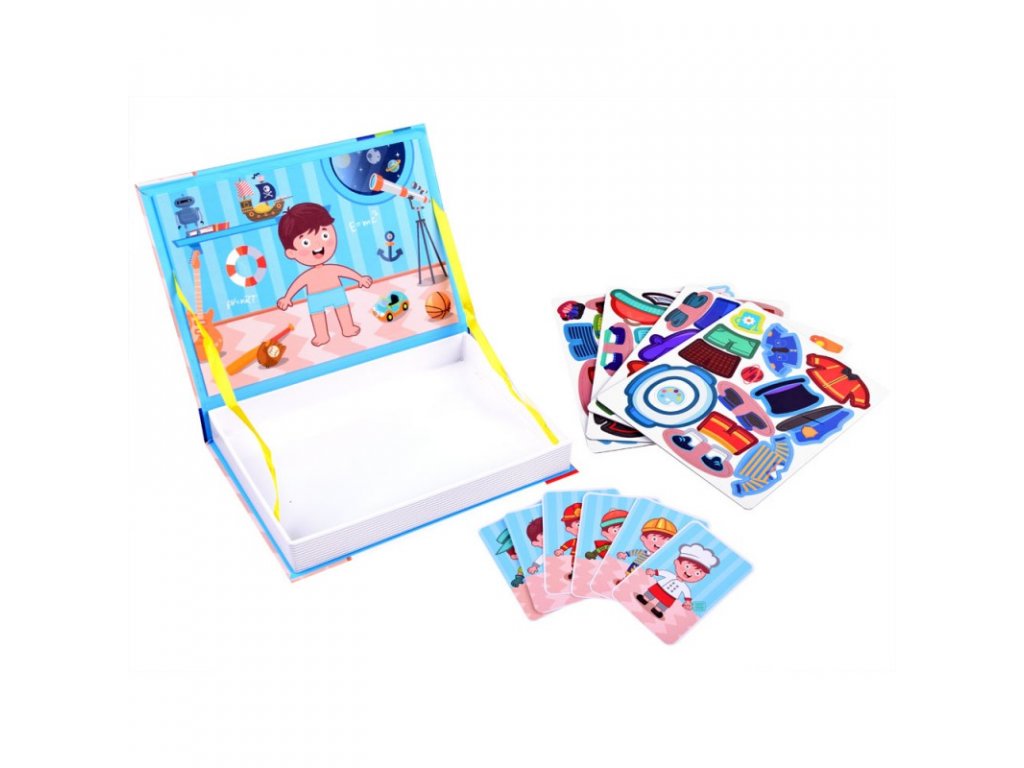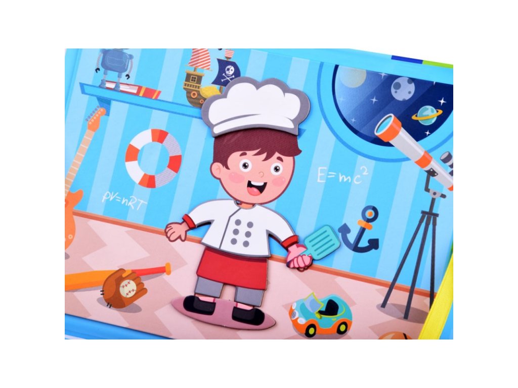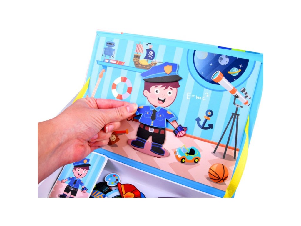 A munkaszakmákat tartalmazó mágneses könyv ideális készlet azoknak a gyerekeknek, akik jövőbeli munkájukon gondolkodnak. A csomag 59 elemet tartalmaz, és lehetővé teszi a gyermek számára, hogy különböző szakmákat tervezzen. Az egész ruhakészlet keménykötésű. Nagyszerű szórakozás gyerekeknek.