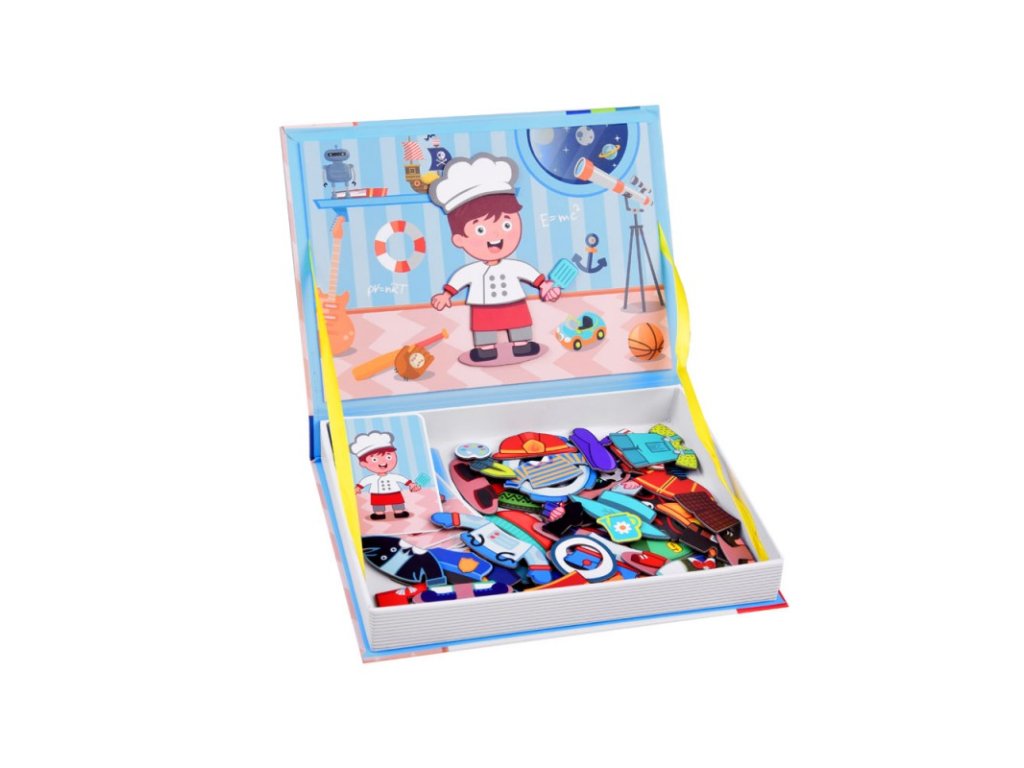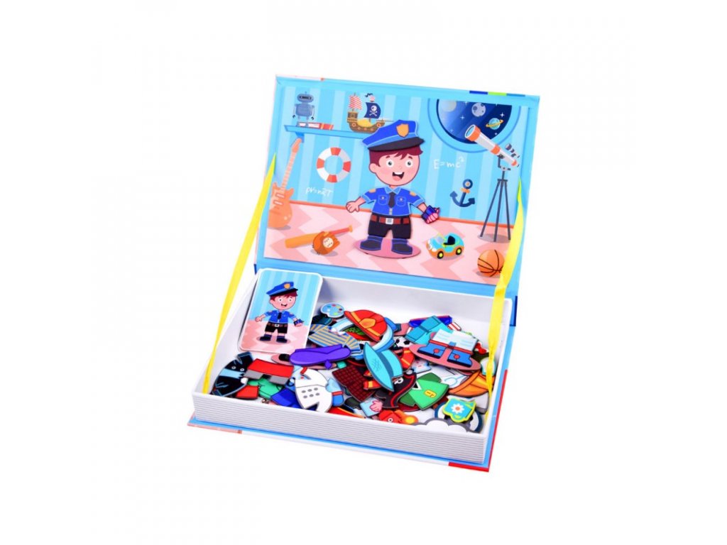 A munkaszakmákat tartalmazó mágneses könyv ideális készlet azoknak a gyerekeknek, akik jövőbeli munkájukon gondolkodnak. A csomag 59 elemet tartalmaz, és lehetővé teszi a gyermek számára, hogy különböző szakmákat tervezzen.