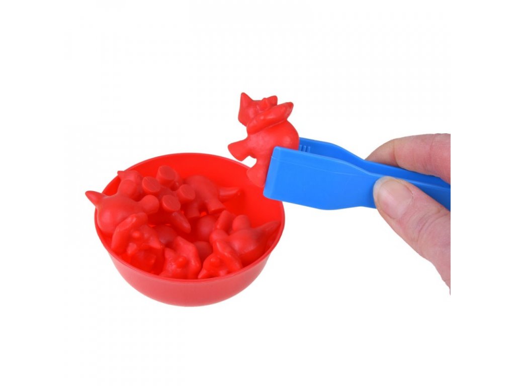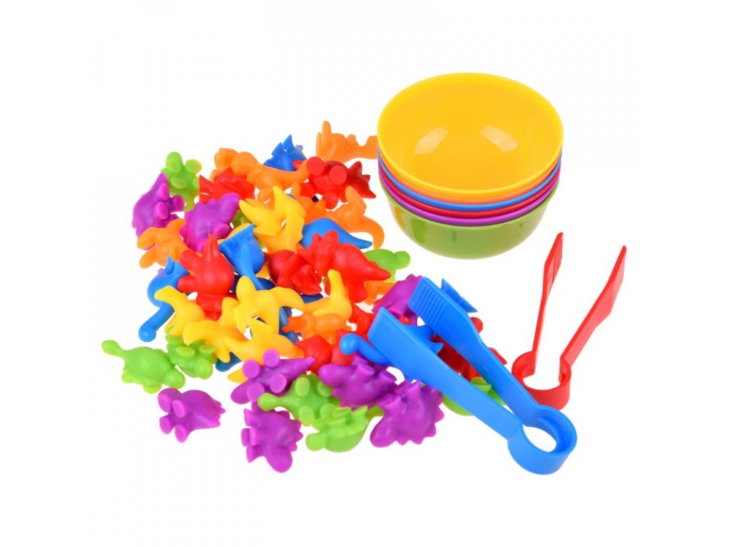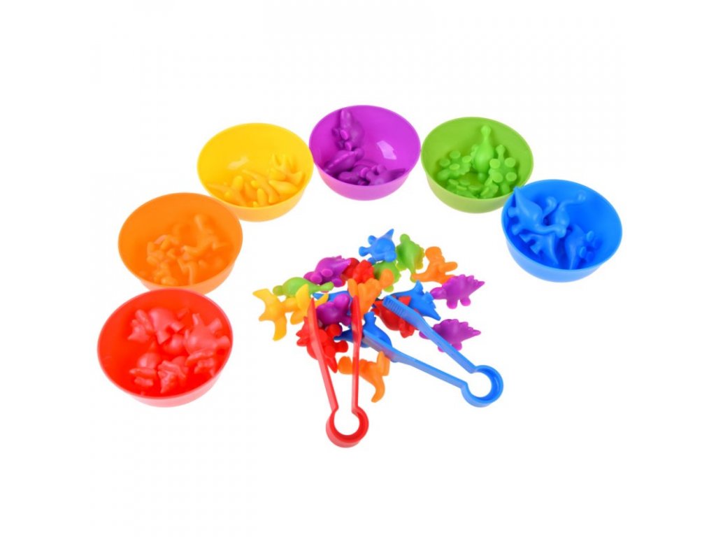 - Keverje össze az összes dinoszauruszt, és tegye ki a tálakat. A gyermek feladata, hogy csipesszel szétválogatja a dinoszauruszokat, és a megfelelő színt a megfelelő tálba tegye.