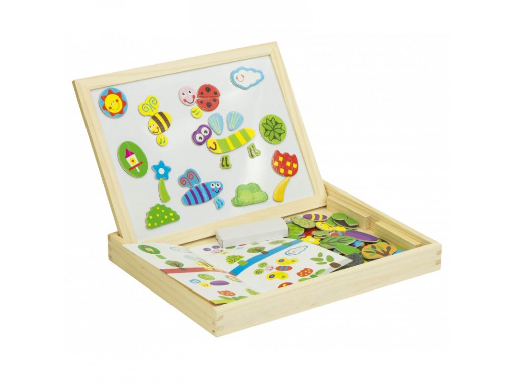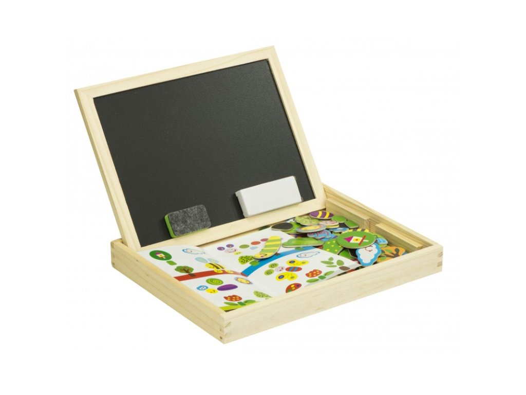 Az asztal kizárólag fából készült - minden tökéletesen csiszolt és biztonságos a legkisebb gyerekek számára. A készletben találunk mágneses blokkokat, krétát, szivacsot, színkönyvet elrendezett minták példáival és természetesen kétoldalas táblát mágnesekhez és krétához. A tábla fekete oldala krétával való festésre szolgál. A tábla fehér oldala markerekkel való festésre szolgál. A fehér rész is mágneses, így lehetőség van rá mágneseket helyezni.