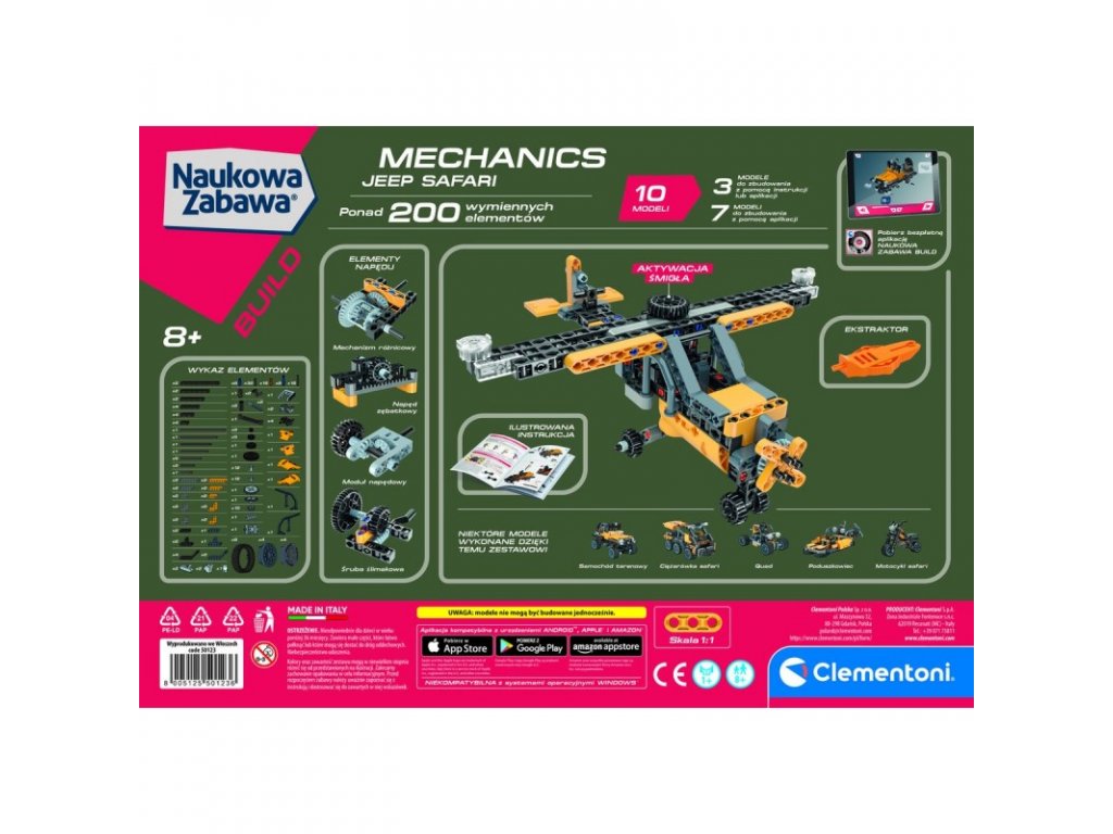 Nagyszerű készlet a kis szerelőknek, amely 10 különböző járműmodell összeállításához szükséges alkatrészeket tartalmaz! A modellek elem nélkül működnek. Komplett készlet több mint 200 cserélhető alkatrészt, például lapos- és kúpfogaskerekeket, fogasléceket, differenciálműveket, csigacsavarokat, gumiabroncsokat, rudakat és paneleket. A járművek 4 különböző típusú hajtással szerelhetők össze, melyek a csomag részét képezik. A használati útmutató segít a gyerekeknek modellek készítésében, és bevezeti őket a mechanika és mérnöki alapelvekbe. Próbáljon meg modelleket építeni egy ingyenes APP-vel, amely lépésről lépésre végigvezeti Önt az összeállításon animációk és 3D modellek segítségével.