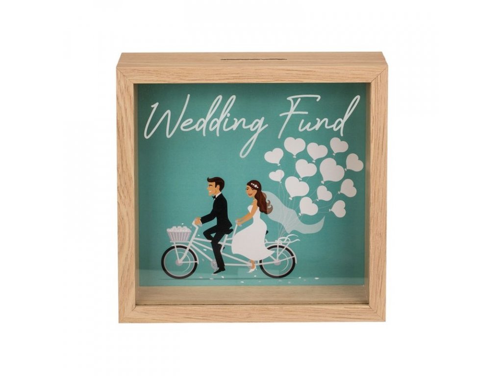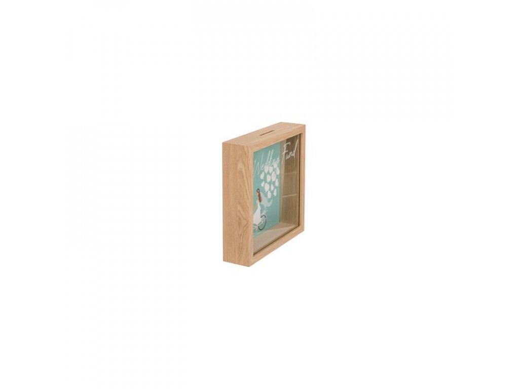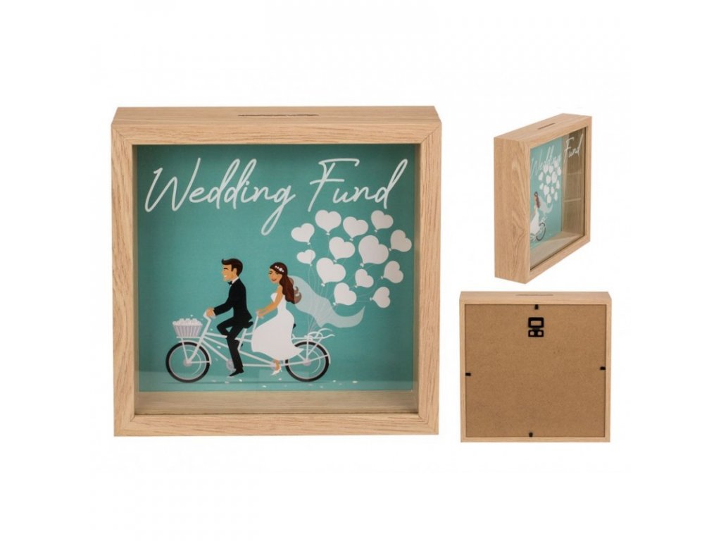 Nagyon vonzó fából készült persely egy szerető pár hátterével. A perselyen „Wedding Fund“ felirat található, ami lefordítva esküvői alapot jelent, aminek köszönhetően a persely ideális egy álomesküvőre való megtakarításhoz.