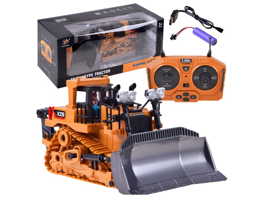 A távirányítós buldózer nagyszerű játék lesz az építőipari járművek minden rajongójának. A buldózer gondosan készült, minden részletre odafigyelve. A buldózer teste kiváló minőségű, sérülésálló műanyagból készült. A gumihevederek bármilyen felületen javítják a jármű tapadását. A penge és a talaj fellazítására szolgáló horog fémből készült, ami biztosítja a játék tartósságát. Az egész az építőipari járművekre jellemző narancs-szürke színkombinációban marad meg. A játék hang- és fényeffektusokkal van felszerelve. Indításkor és menet közben a készülék járó motor hangját és kanyarodáskor szaggatott hangjelzést ad ki. A buldózernek négy lámpája van az elülső részén, a penge felett. A buldózer karjai teljesen irányíthatók, a penge a távirányítóval emelhető és süllyeszthető. Kipróbálhatja az ekét például a padlón szétszórt építőkészleten. A buldózer biztonságosan összegyűjti az összes kisebb tárgyat az útból, és nagyszerű módja annak, hogy játékos formában motiválja a gyerekeket a takarításra. A játék könnyedén megbirkózik a kisebb akadályokkal. A hátsó horog csak kézzel mozgatható. A jármű újratölthető akkumulátorral működik, ami jelentősen csökkenti az üzemeltetési költségeket (töltési idő kb. 3-4 óra).