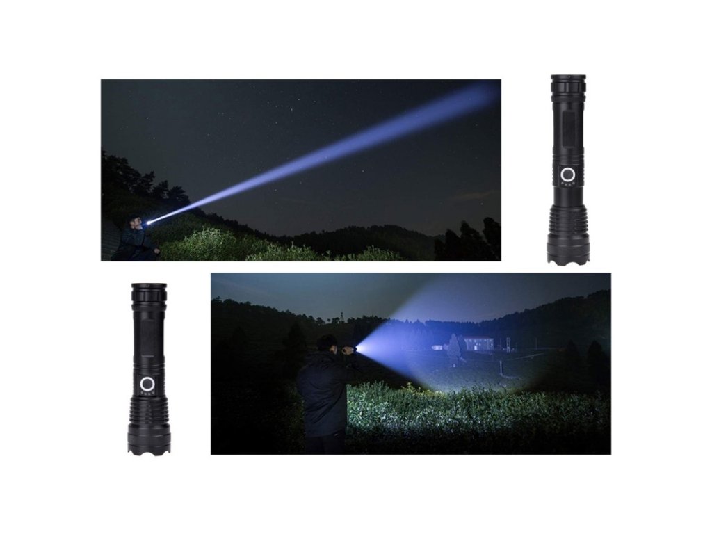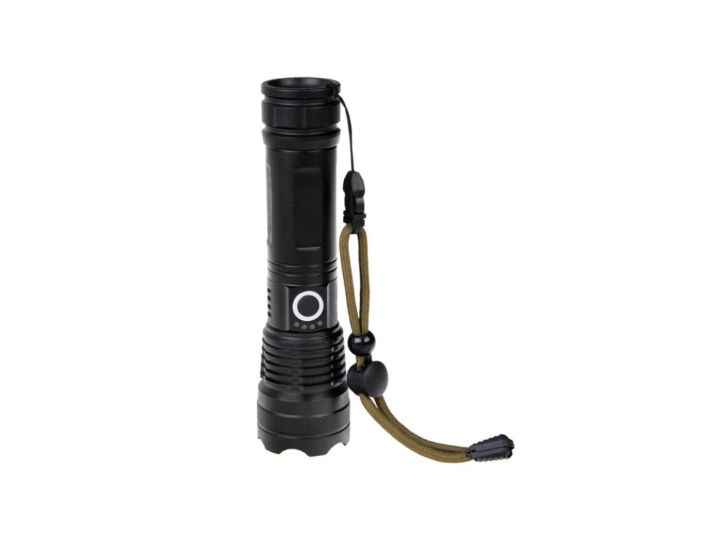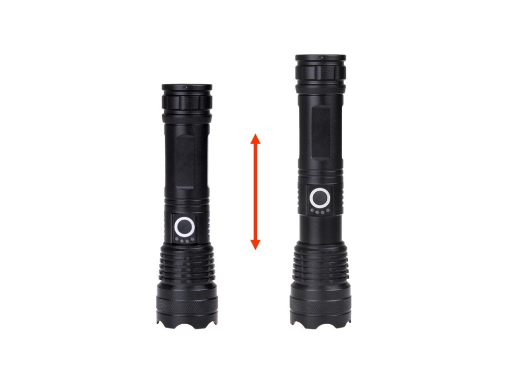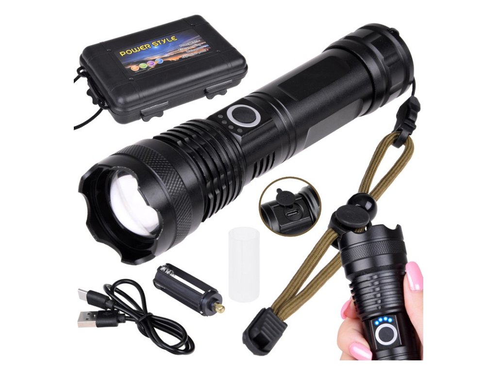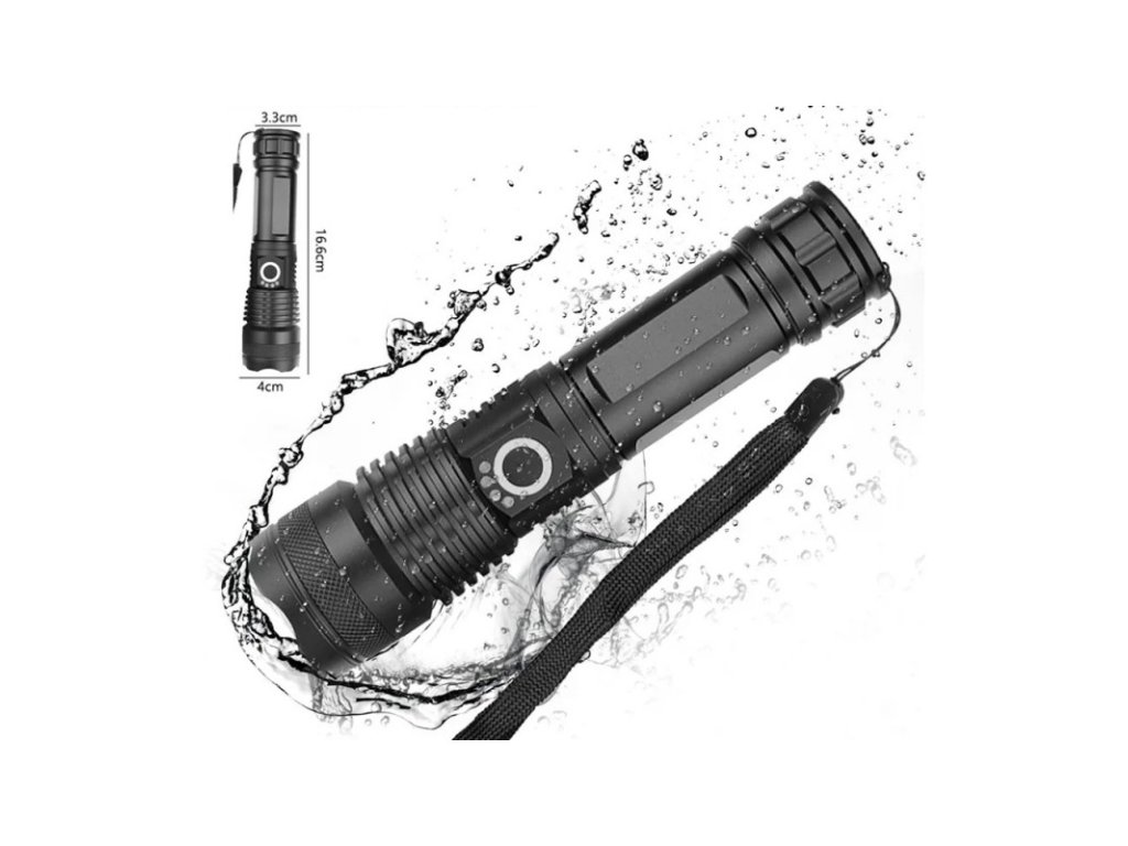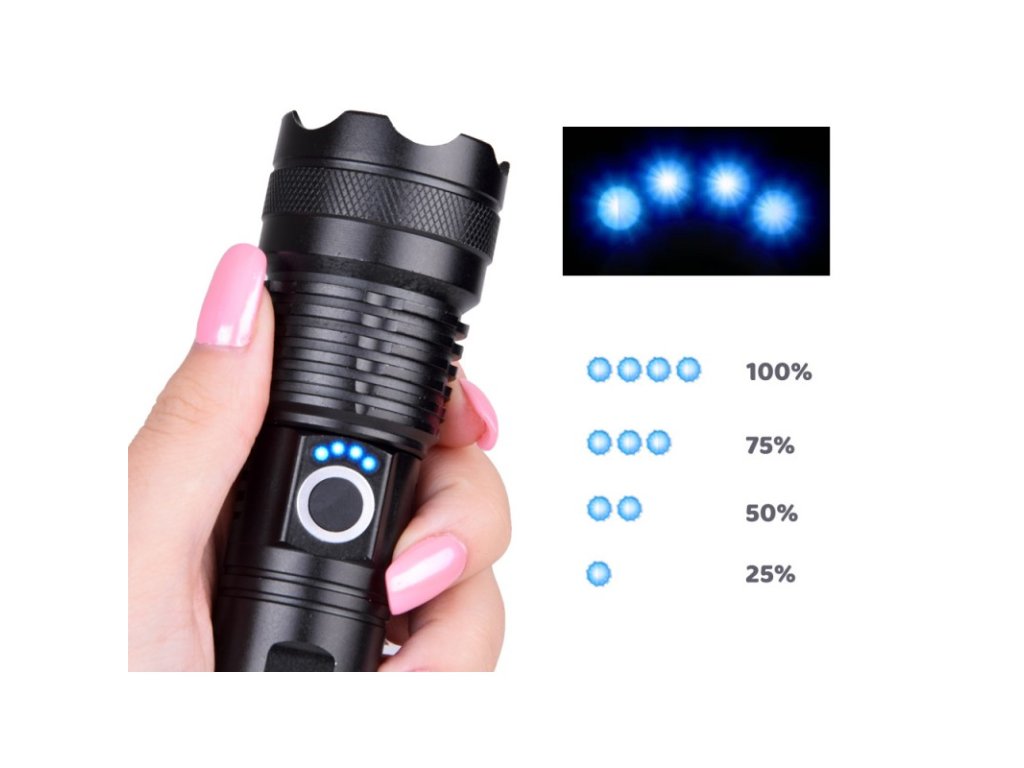 A gomb felett négy kék LED jelzi a készülék töltöttségi szintjét, előre láthatja, hogy mikor kell újratölteni az akkumulátort, hogy ne a nem megfelelő pillanatban hirtelen lemerüljön, illetve a LED-eknek köszönhetően meg tudja állapítani, hogy mikor kell az akkumulátort feltölteni. teljesen fel van töltve. A zseblámpához USB Type-C kábel is tartozik, amely lehetővé teszi a zseblámpa normál telefontöltővel történő töltését. A zseblámpa zoom funkcióval rendelkezik, amely lehetővé teszi a fény távolságának zökkenőmentes megváltoztatását a fókuszáló lencse használatának köszönhetően. Ez lehetővé teszi a beállítást a keskeny, erős, hosszú hatótávolságú fénysugártól a széles sugárig, amely megvilágítja a nagy munkaterületet. A zseblámpa vízállóságának nagy előnye, hogy különféle időjárási és környezeti körülmények között is használható, nem kell aggódni, vízálló.