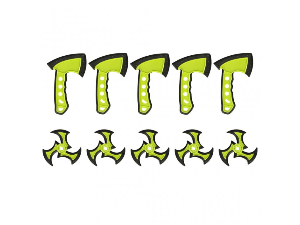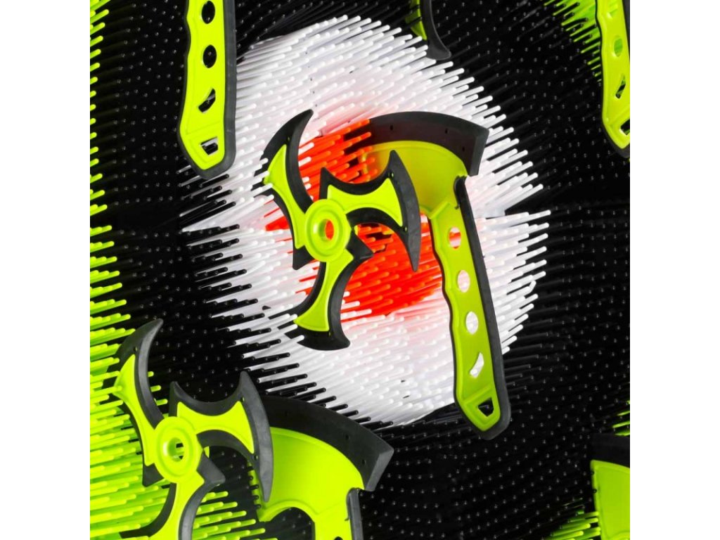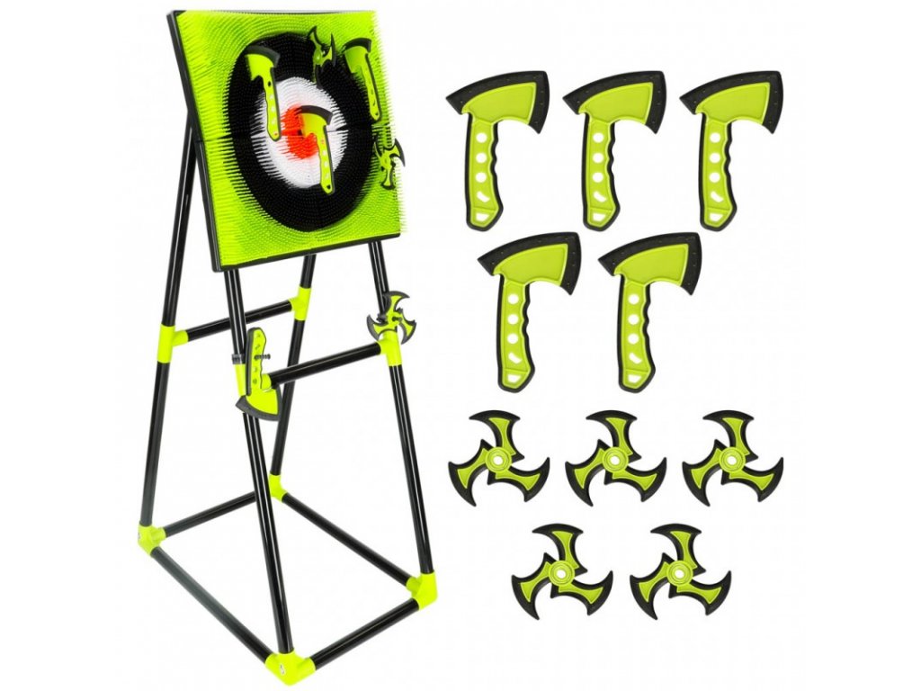 Egy arcade játék, amely több órányi szórakozást biztosít – egy szilikon céltábla fejszék és shuriken dobásához. A játék során a gyerekek elengedhetik belső harcosukat, vagy mozgékony nindzsának érezhetik magukat. A készlet 5 db műanyag fejszét és 5 db shurikent tartalmaz. A pontosság gyakorlása érdekében közel dobhatja a kiegészítőket, vagy egyre nagyobb távolságról dobva növelheti a nehézségi szintet. A fejszéknek és a shurikennek nincsenek éles szélei, és szilikonnal vannak bevonva, így biztonságosan játszhatnak velük. A pajzs is szilikonból készült, így a kidobott tárgyak könnyen rátapadnak.