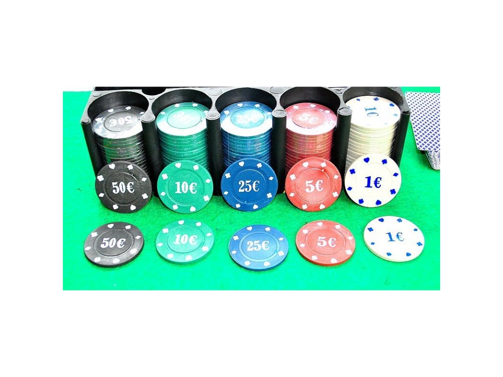 - 200 db különböző címletű játékzseton 1 €, 5 €, 10 €, 25 €, 50 €