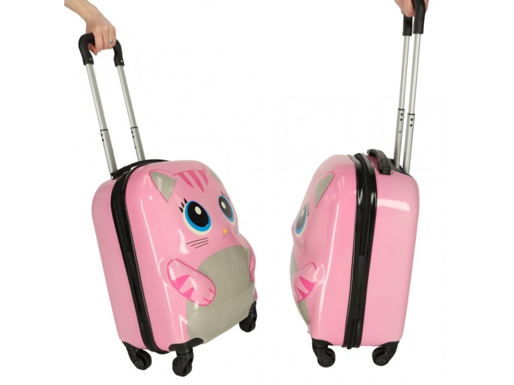 A rózsaszín gyerek bőrönd macskagrafikával tökéletes kiegészítője a kis felfedezőnek. A maximális utazási kényelem érdekében a bőrönd kihúzható fogantyúval és négy 360 fokban forgó kerékkel van felszerelve a könnyű húzáshoz.