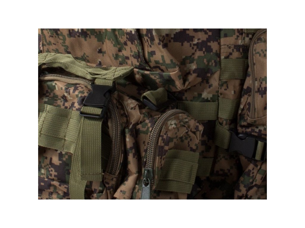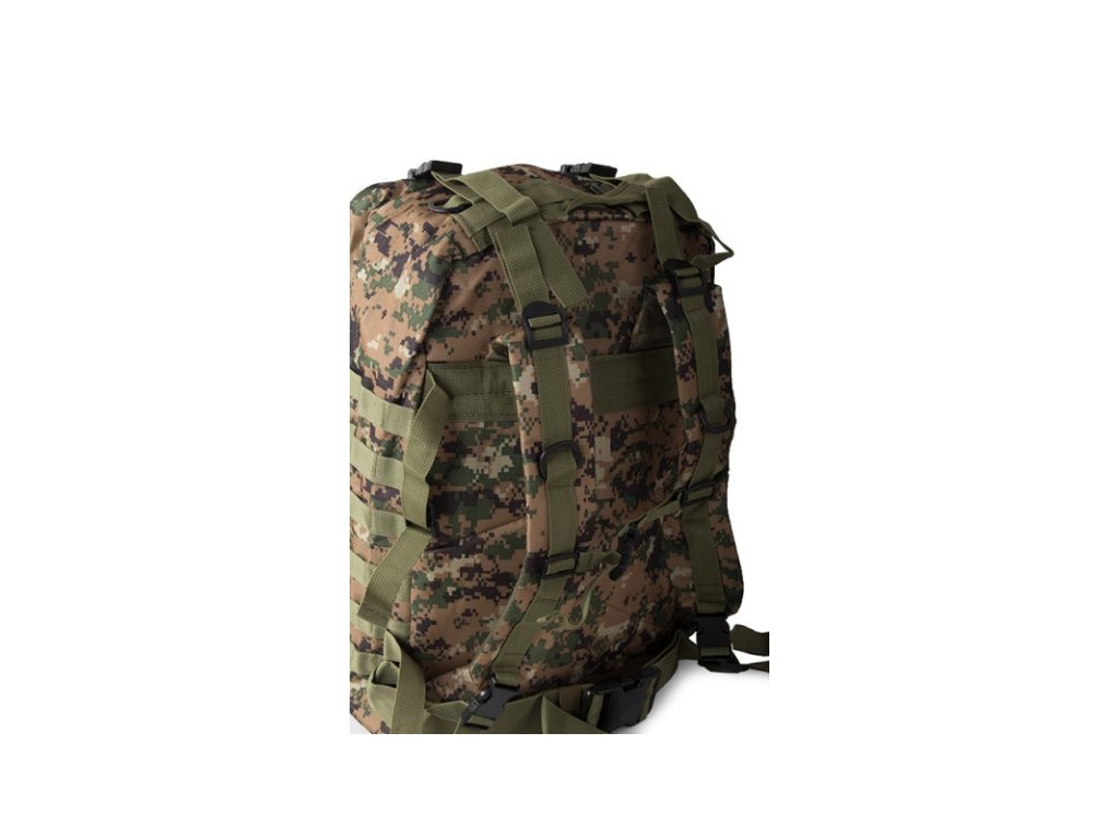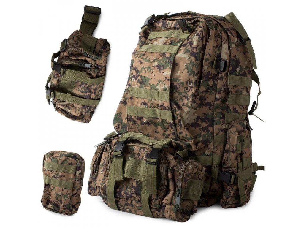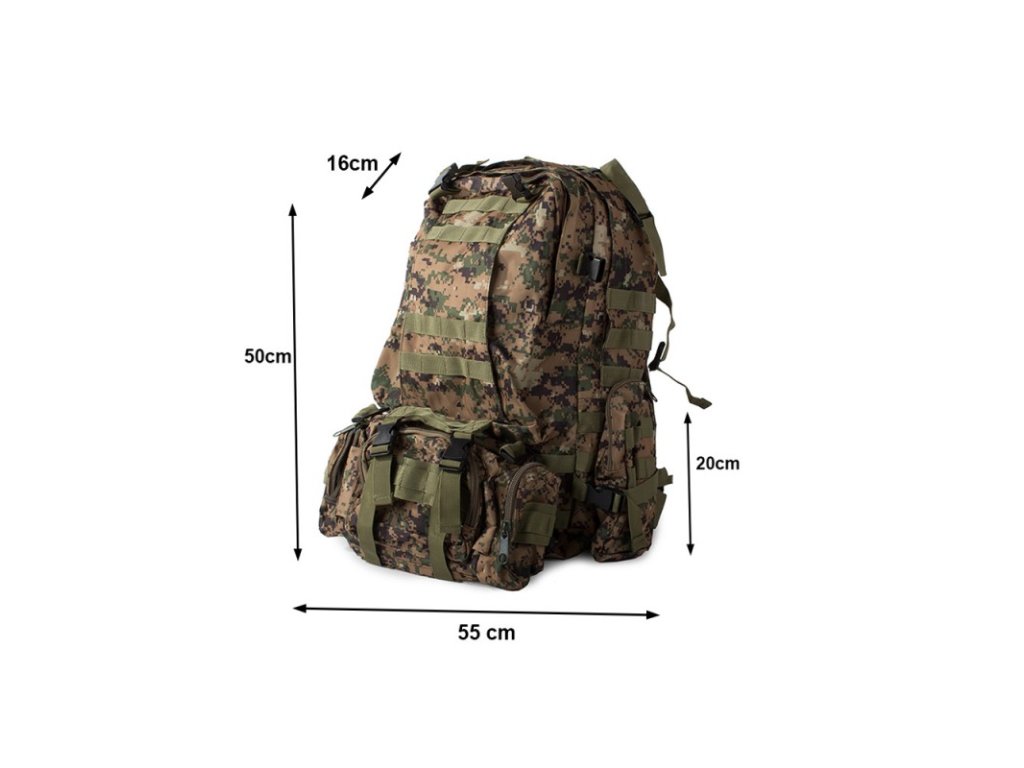 A katonai témájú turista hátizsák vonzó lesz a hegymászás szerelmeseinek és az extrém körülmények közötti túlélés mestereinek. A hátizsák anyaga vízálló, így rossz időjárási körülmények között is kirándulhatsz. Ezenkívül nagyon erős és ellenáll a különböző típusú kopásnak. A hátizsák egy nagy rekeszből, egy kisebb belső rekesszel és egy hálós zsebből áll. Két további zseb található az oldalakon, amelyek szükség esetén lecsatolhatók. Középen egy nagyobb zseb is található, ami lecsatolható és külön is hordható deréktáskaként. 4 kisebb kamrából áll - két oldalsó és két középső. Kiválóan alkalmas különféle kisebb tárgyakhoz, kütyükhöz és dokumentumokhoz. Rögzítheti közvetlenül a nadrág övére, vagy hordhatja egy rögzített övvel normál mellényként. A hátizsák állítható rögzítőelemekkel rendelkezik a MOLLE rendszerben, amely lehetővé teszi további zsebek és modulok hozzáadását a táskához. Ezenkívül mellkasi és derékövvel is fel van szerelve - ez lehetővé teszi a gerinc és a vállak tehermentesítését hosszú utak során. Az állítható hevederek különösen hasznosak kabátok, sátrak, szőnyegek hordozásakor. A deréköv fix csattal és hosszállítással rendelkezik. Övvel rögzítve a hátizsák nagyon stabil, nem dől oldalra viseléskor.