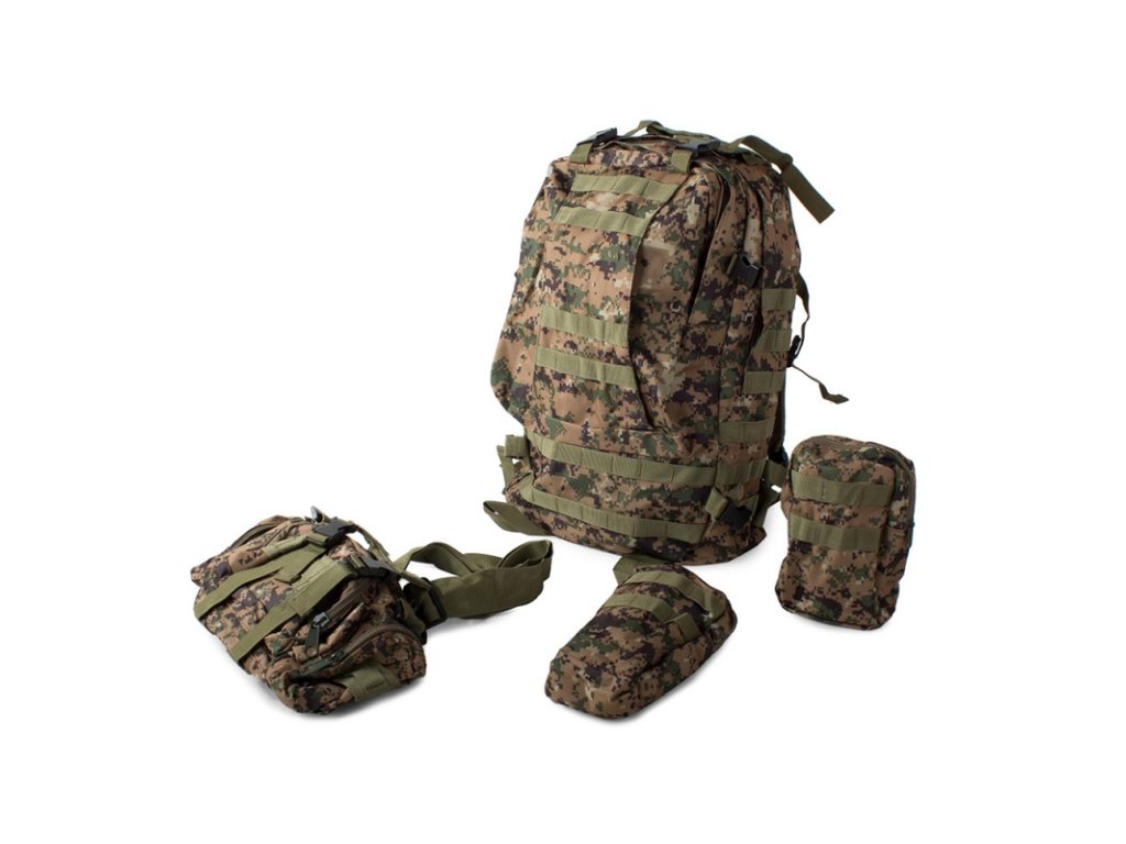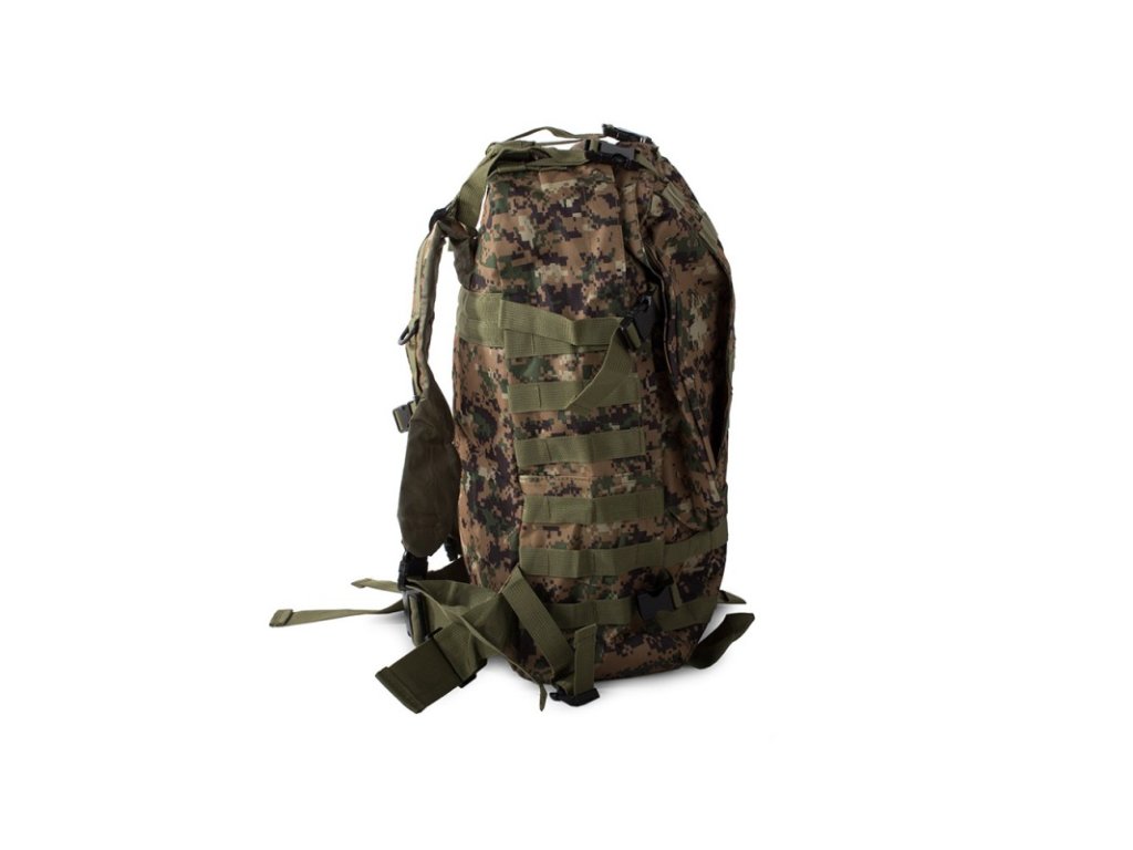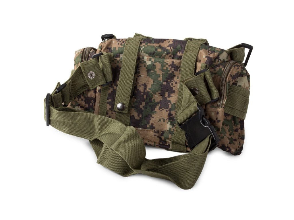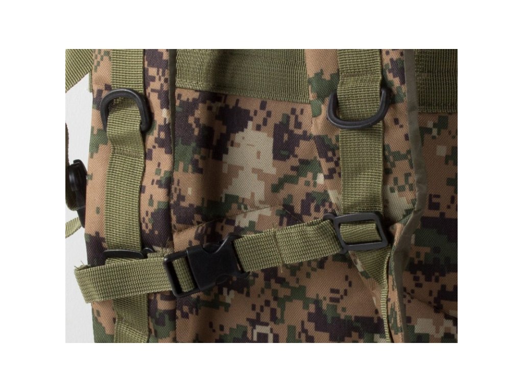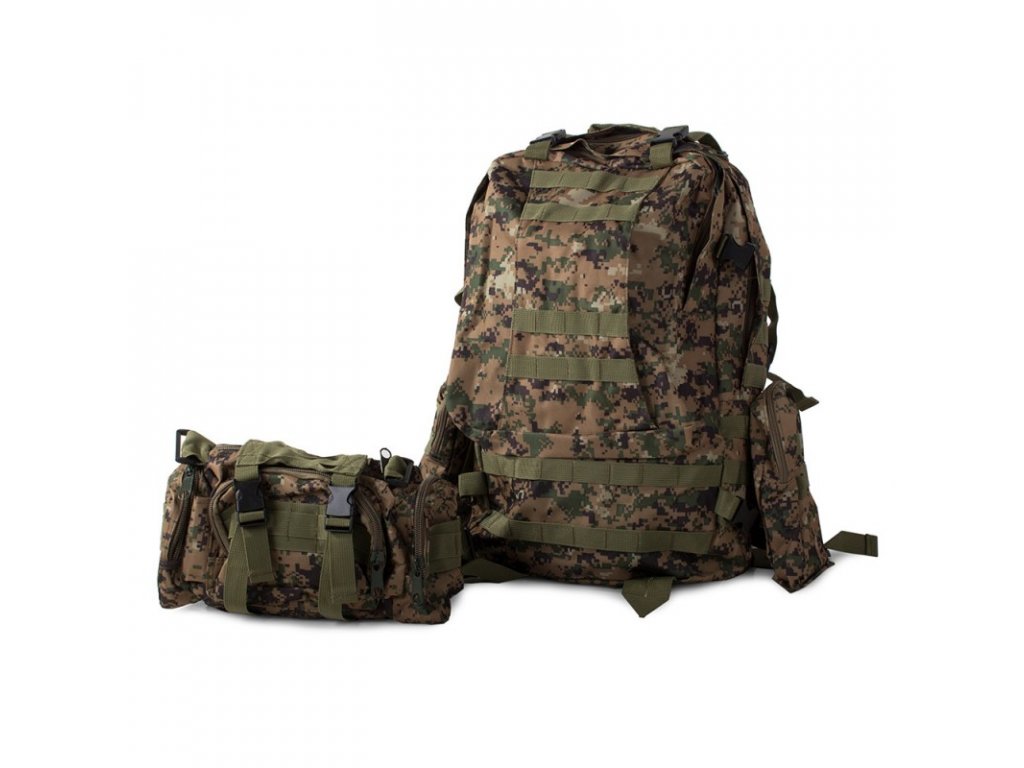 A katonai témájú turista hátizsák vonzó lesz a hegymászás szerelmeseinek és az extrém körülmények közötti túlélés mestereinek. A hátizsák anyaga vízálló, így rossz időjárási körülmények között is kirándulhatsz. Ezenkívül nagyon erős és ellenáll a különböző típusú kopásnak. A hátizsák egy nagy rekeszből, egy kisebb belső rekesszel és egy hálós zsebből áll. Két további zseb található az oldalakon, amelyek szükség esetén lecsatolhatók. Középen egy nagyobb zseb is található, ami lecsatolható és külön is hordható deréktáskaként. 4 kisebb kamrából áll - két oldalsó és két középső. Kiválóan alkalmas különféle kisebb tárgyakhoz, kütyükhöz és dokumentumokhoz. Rögzítheti közvetlenül a nadrág övére, vagy hordhatja egy rögzített övvel normál mellényként. A hátizsák állítható rögzítőelemekkel rendelkezik a MOLLE rendszerben, amely lehetővé teszi további zsebek és modulok hozzáadását a táskához. Ezenkívül mellkasi és derékövvel is fel van szerelve - ez lehetővé teszi a gerinc és a vállak tehermentesítését hosszú utak során. Az állítható hevederek különösen hasznosak kabátok, sátrak, szőnyegek hordozásakor. A deréköv fix csattal és hosszállítással rendelkezik. Övvel rögzítve a hátizsák nagyon stabil, nem dől oldalra viseléskor.