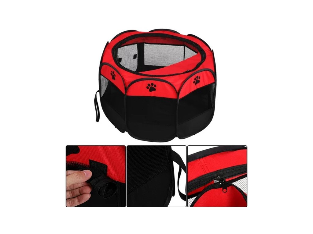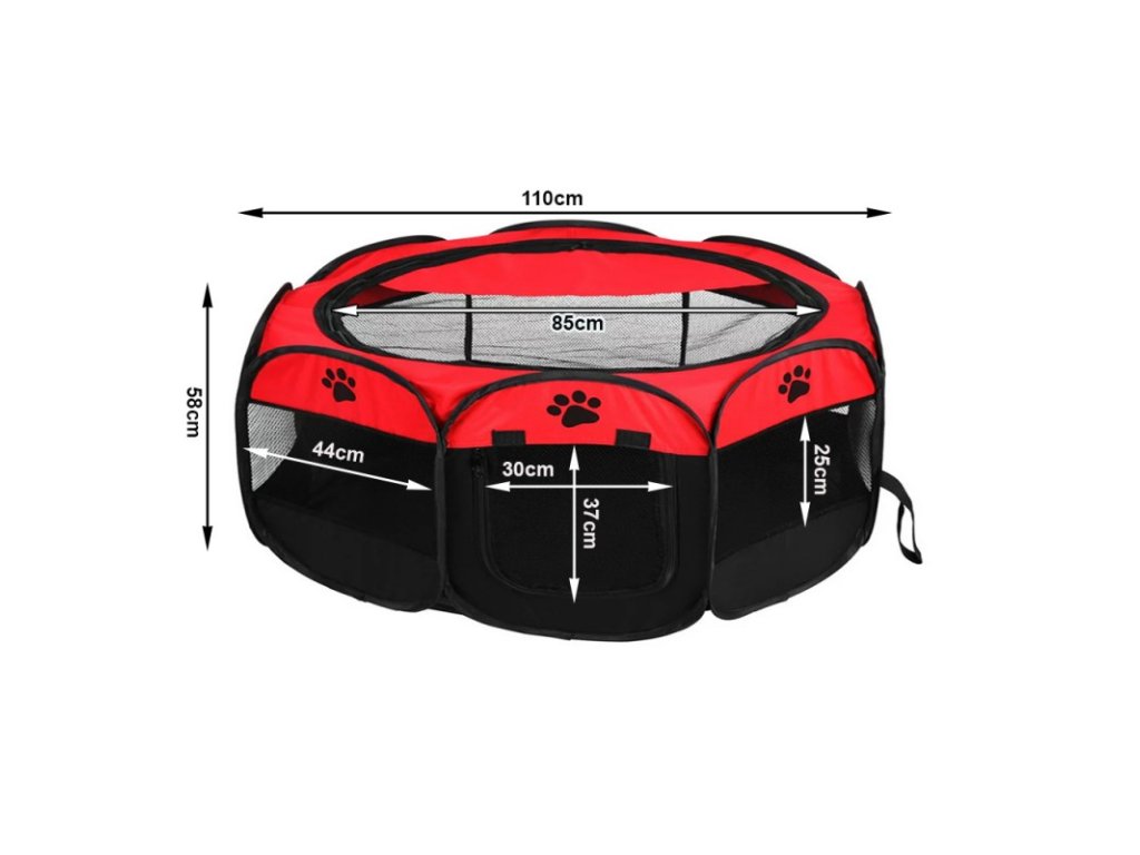 A 110 cm átmérőjű és körülbelül 58 cm magas járóka elegendő helyet biztosít a játékhoz és a mozgáshoz. A körülbelül 37 cm széles bejárati ajtó könnyű hozzáférést biztosít kedvence számára. A nyolcszögletű forma stabilitást és esztétikus megjelenést kölcsönöz a háznak.