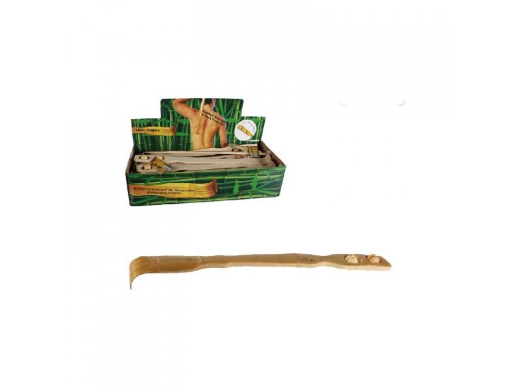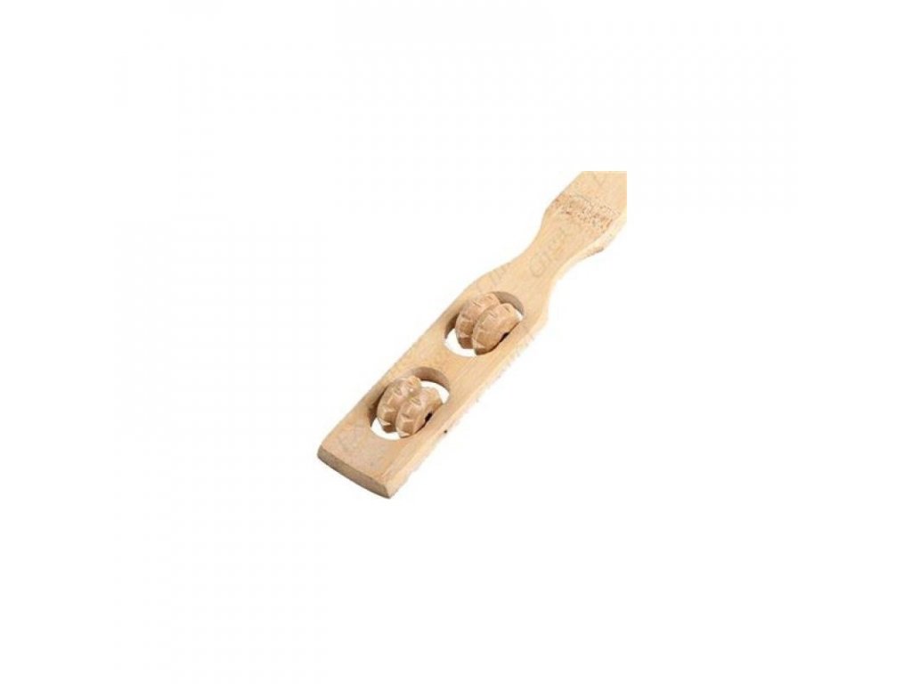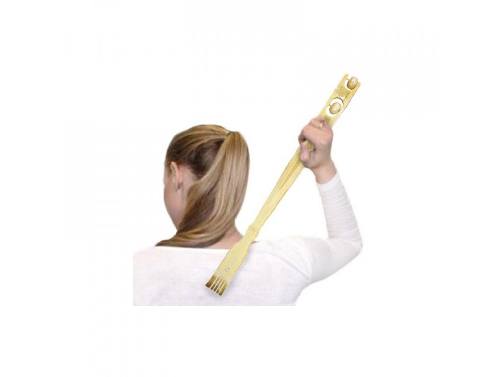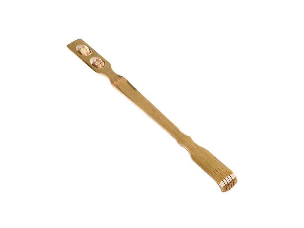 A masszázsbambusz hátvakaró egyik végén kézzel formált karcoló, a másikon pedig masszírozó kerekek találhatók a pihentető masszázs érdekében.
