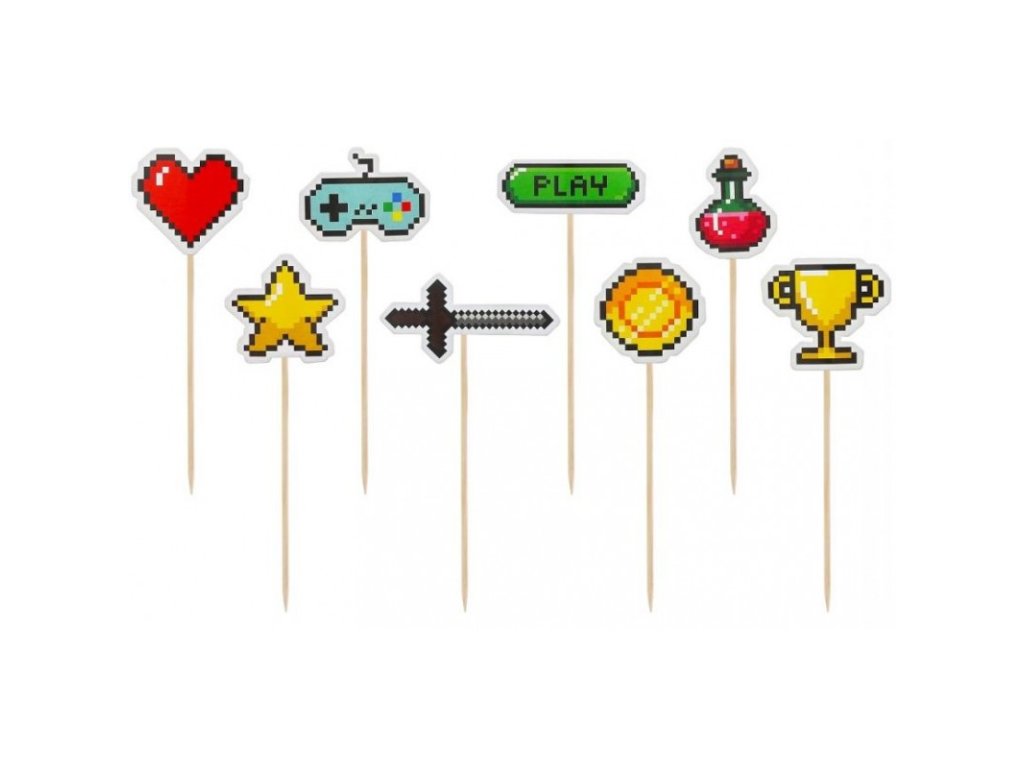 Divatos beszúrók muffinok, szendvicsek vagy sütemények díszítésére a hagyományos retro játékok különböző szimbólumainak aranyos pixel képeivel, bármilyen dekorációt tökéletesítenek.