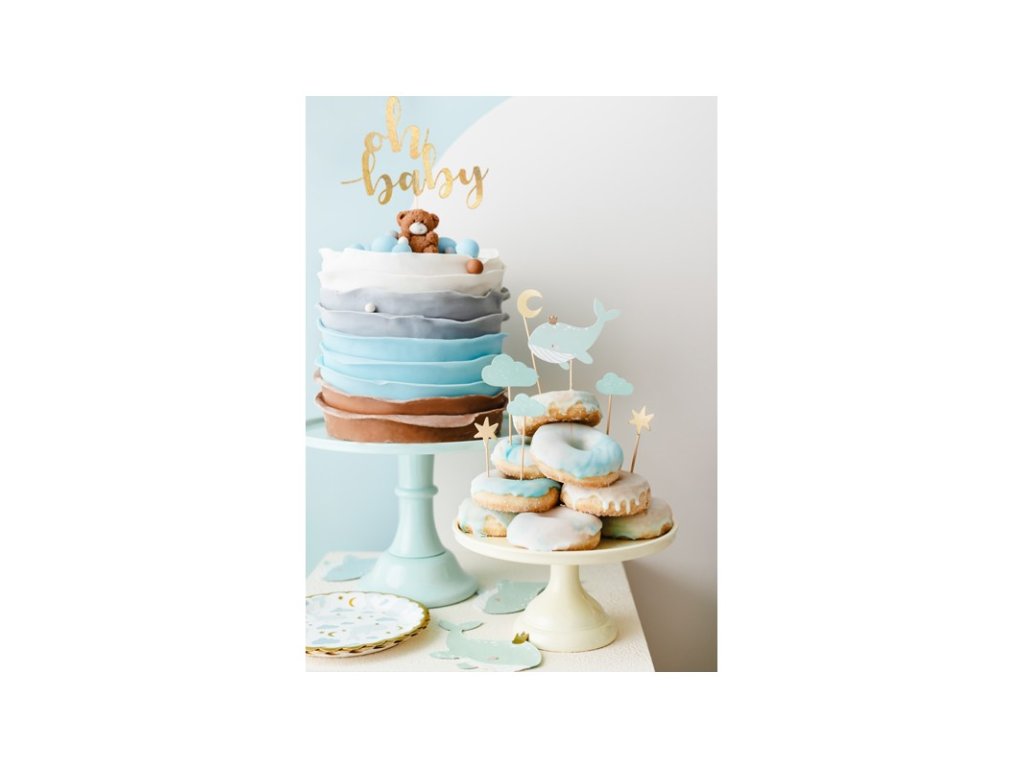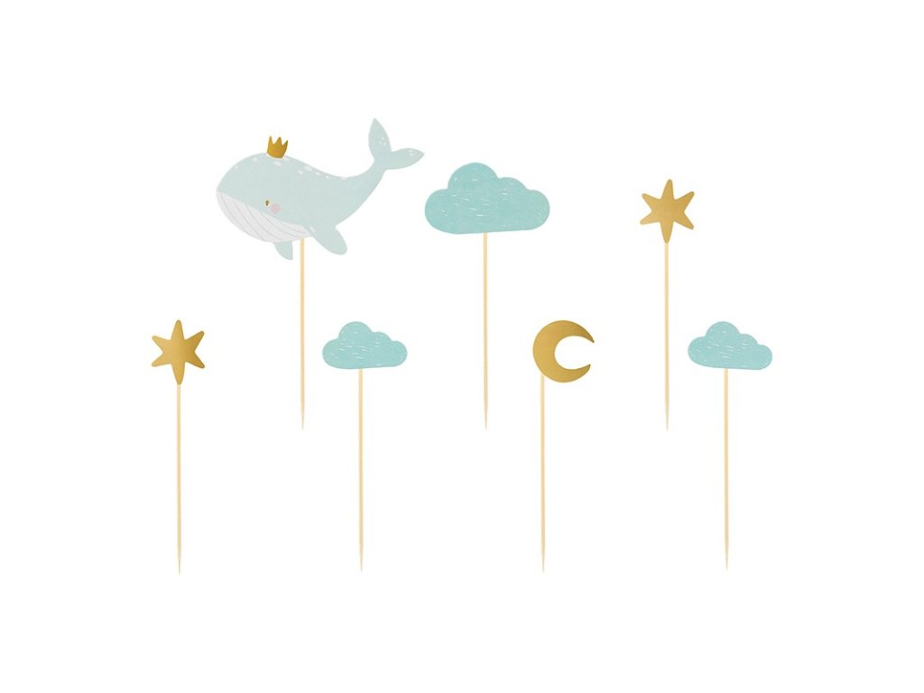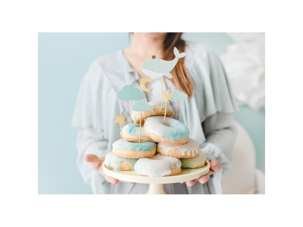 A divatos beszúrók muffinok, szendvicsek vagy sütemények díszítésére kék bálna, felhők és arany csillagok aranyos képével minden dekorációt tökéletesítenek.