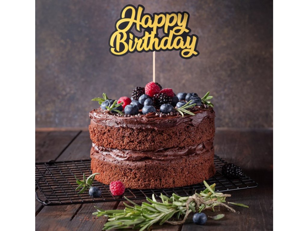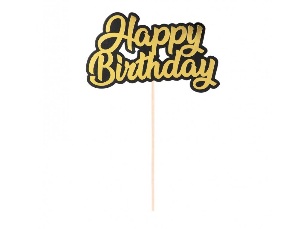 Ünnepelje stílusosan születésnapját ezzel az elegáns tortafeltéttel, amely a lenyűgöző arany betűket finom fekete szegéllyel ötvözi.