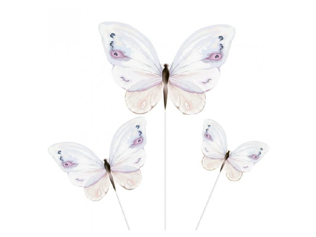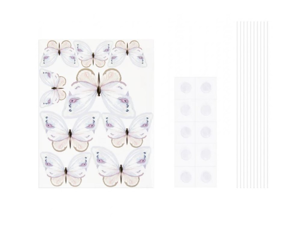 Emelje fel bármely ünnepi torta látványát egy exkluzív felsővel, amely kilenc gyönyörű, különböző méretű pillangót tartalmaz. Ezt az egyedi díszítőelemet pasztell tónusokkal tervezték, túlsúlyban a fehér színnel